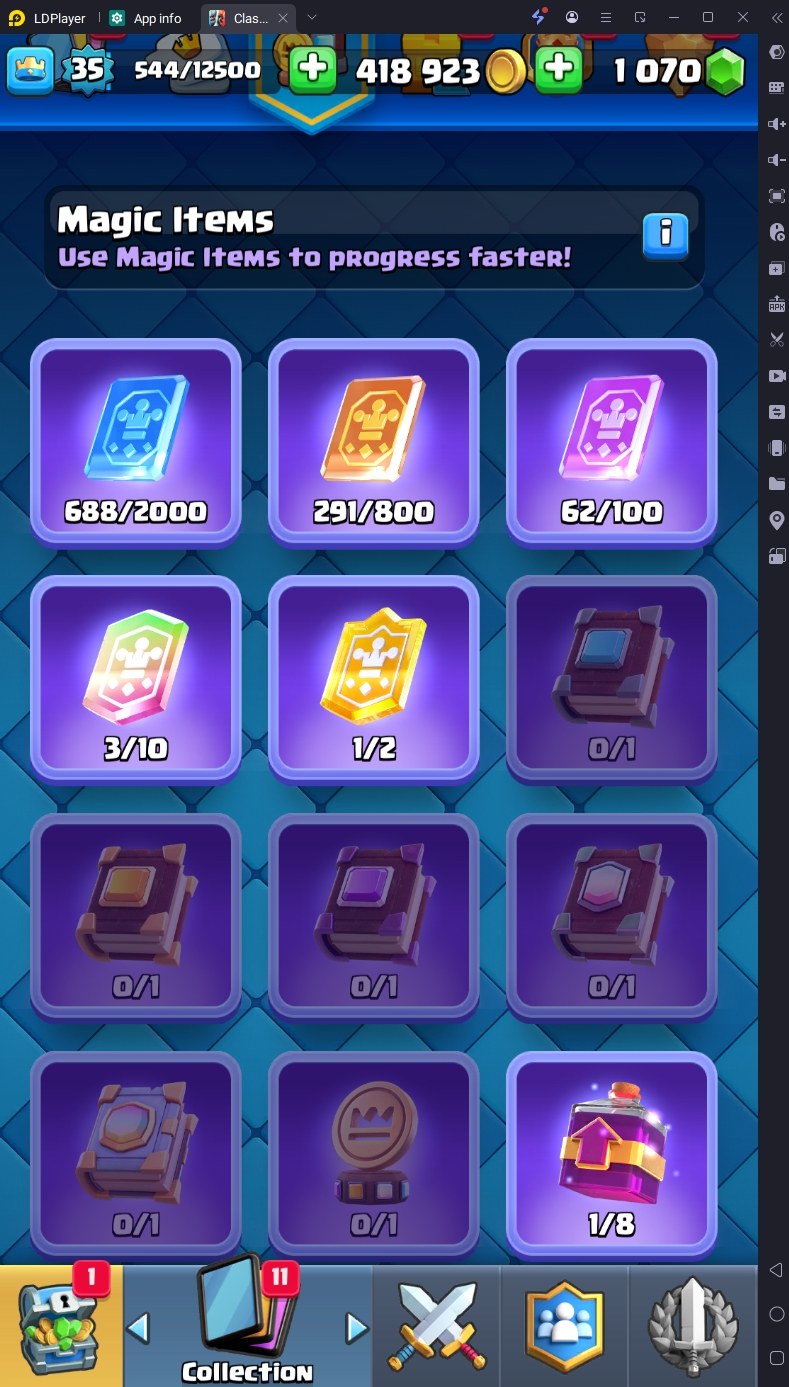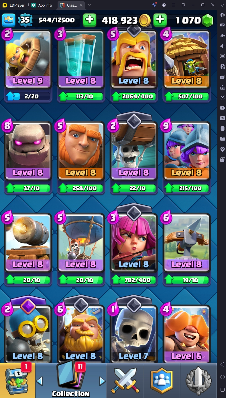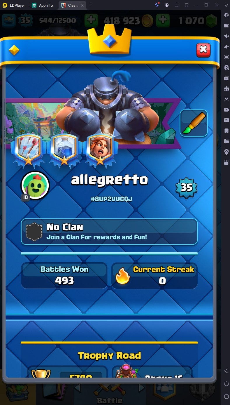 5790 TROPHY 🏆 35 LVL 💯 KT 12 👑 112 CARDS ♦️ 3 MAX CARDS 👑 0 ELITE CARDS 🔮 1 EVO 💯 EMOTE 12 🎭 #8UP2VUCQJ ⸱ TAG ACCOUNT ♥️