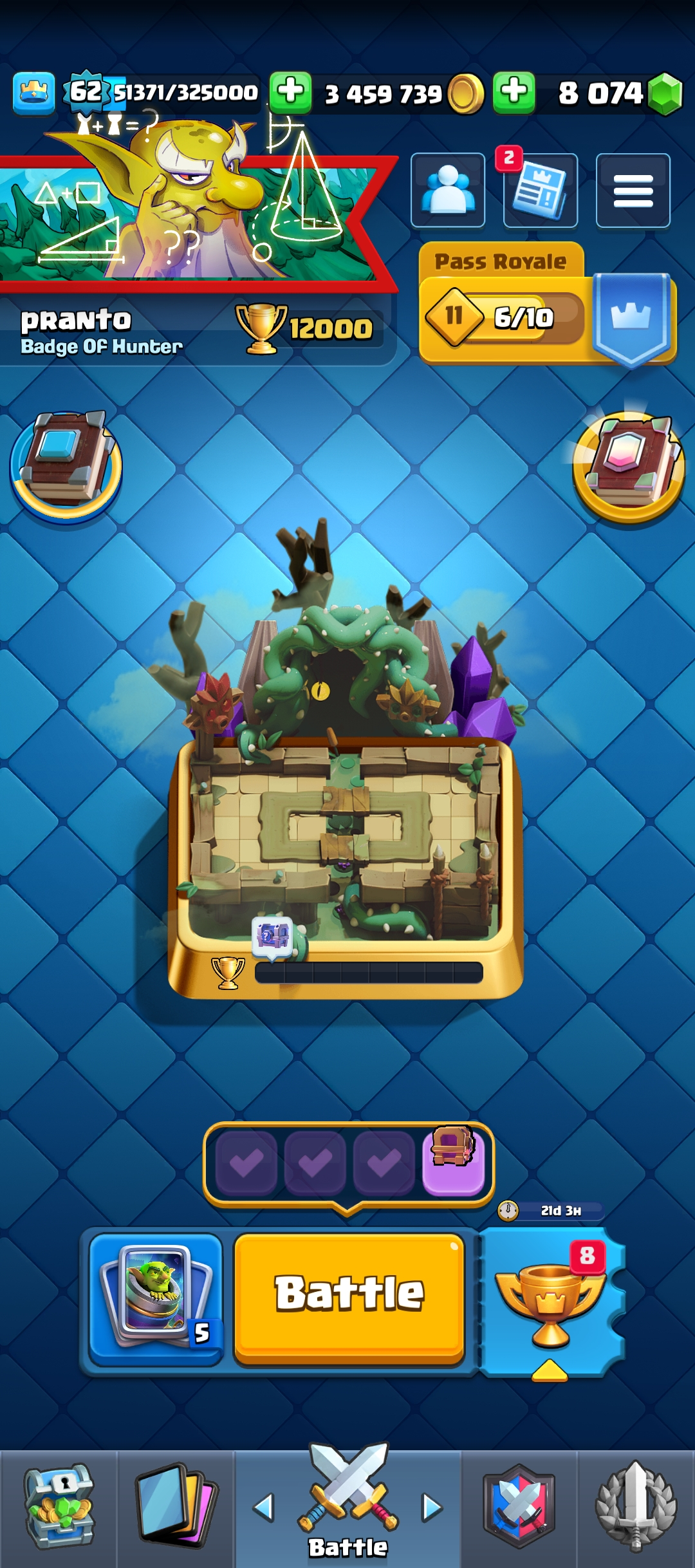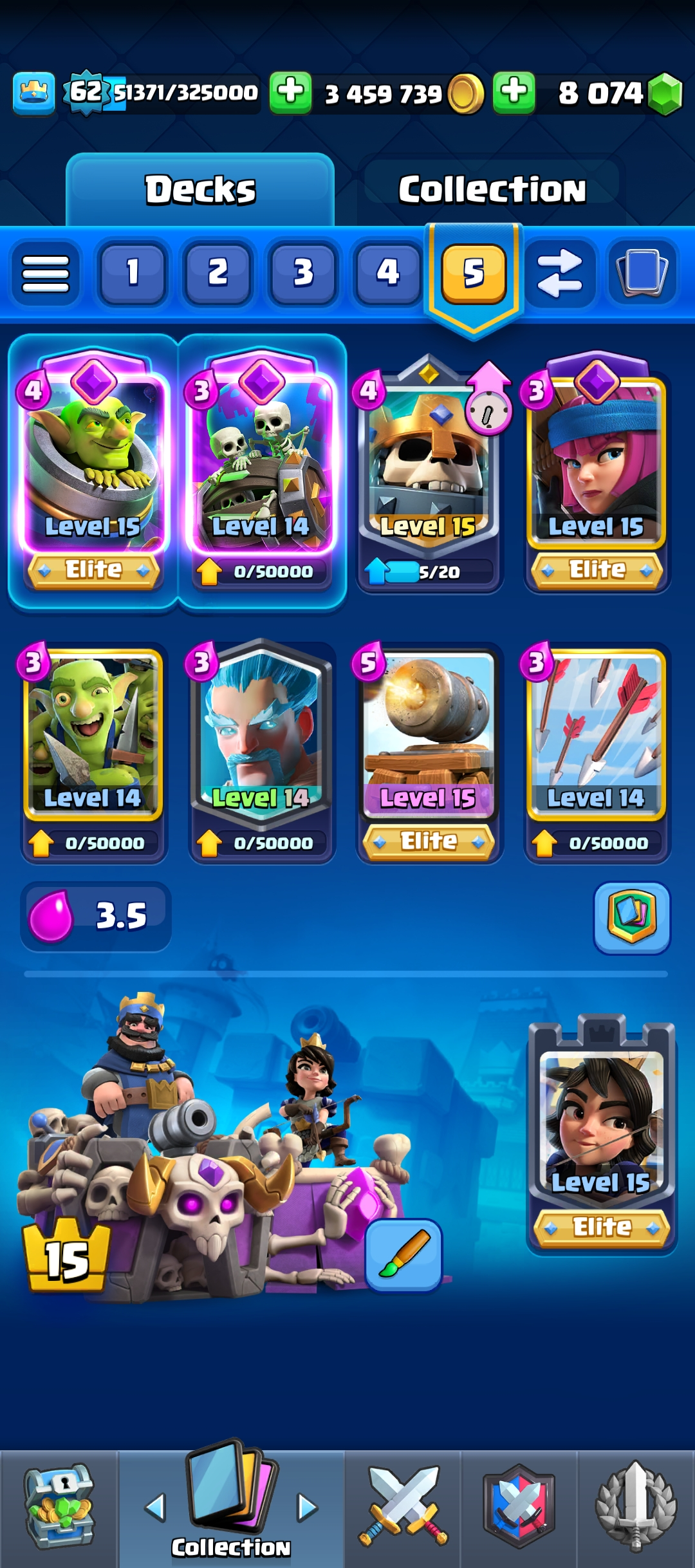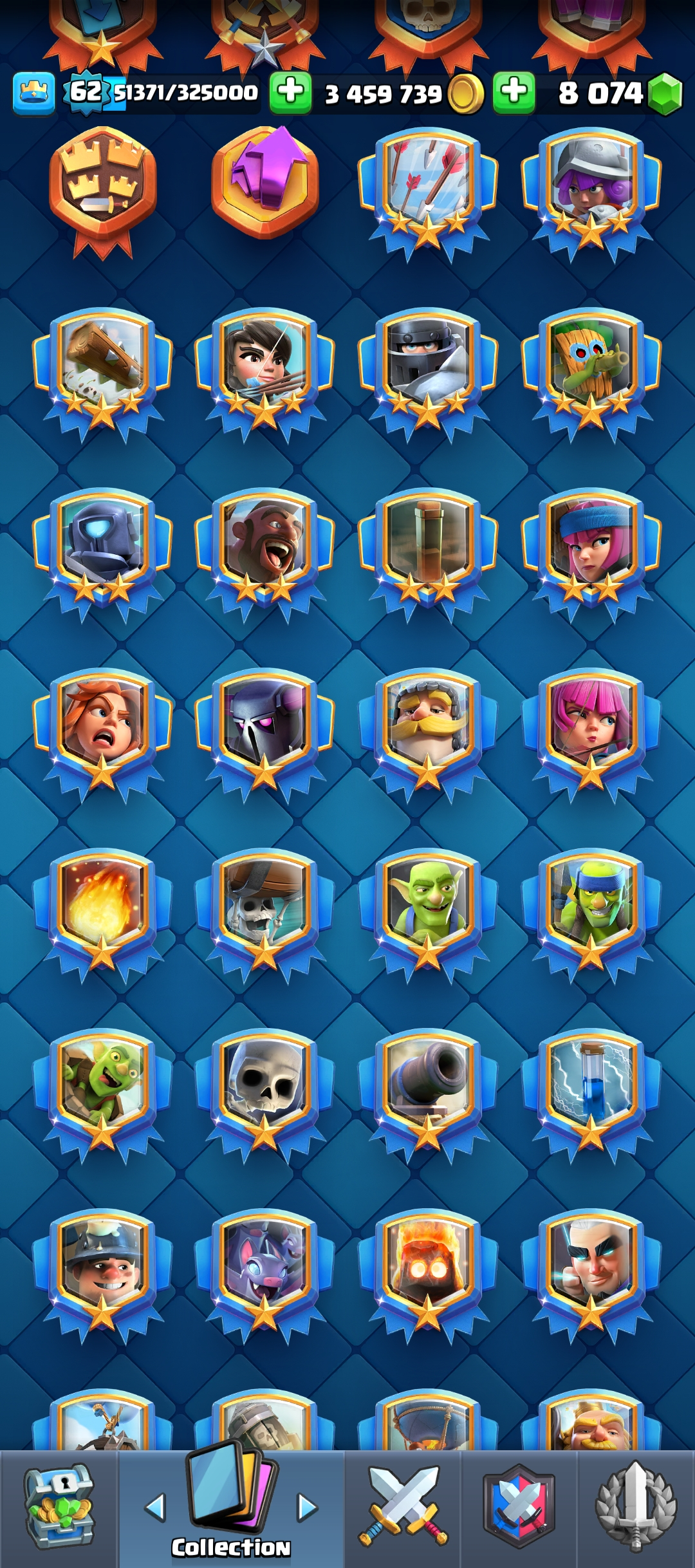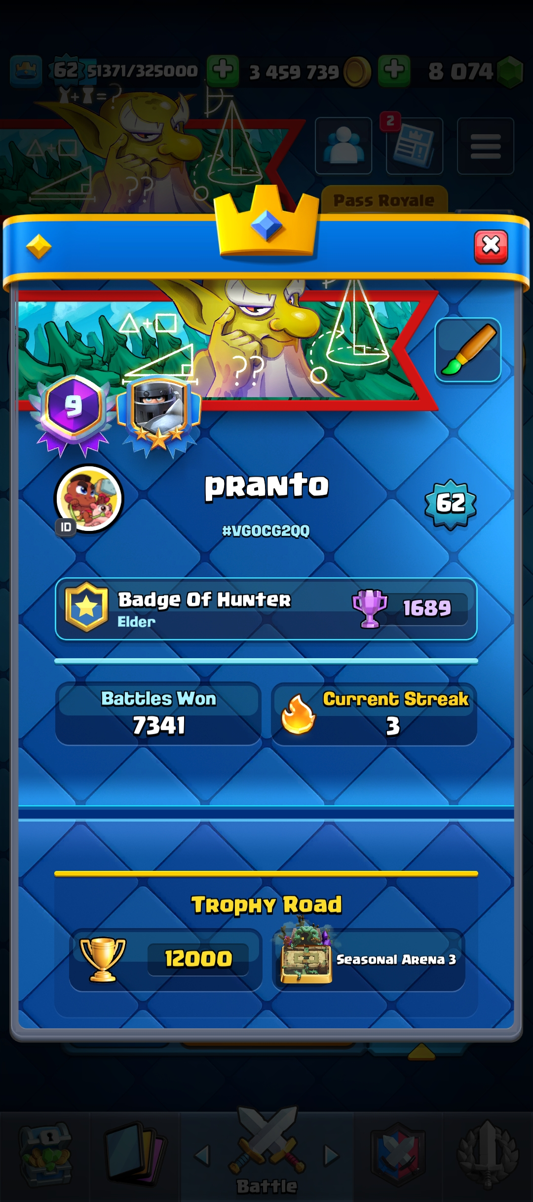 62 level | KT 15 | 9 years old acc| 121 Card | Arena Seasonal 3 | level 14 card 79 | Elate Card 31 | Evo Card 19 | Emote 169 | Tower skin 10 | Trophy 12000 | 8k Gems | 3M Coin| Clash of Clans TH 17 Acc Free
