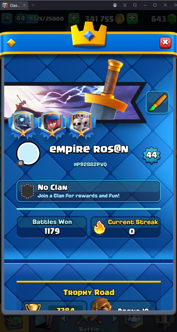 7284 TROPHY 🏆 44 LVL 💯 KT 14 👑 117 CARDS ♦️ EMOTE 29 🎭 #P92882PVQ ⸱ TAG ACCOUNT ♥️