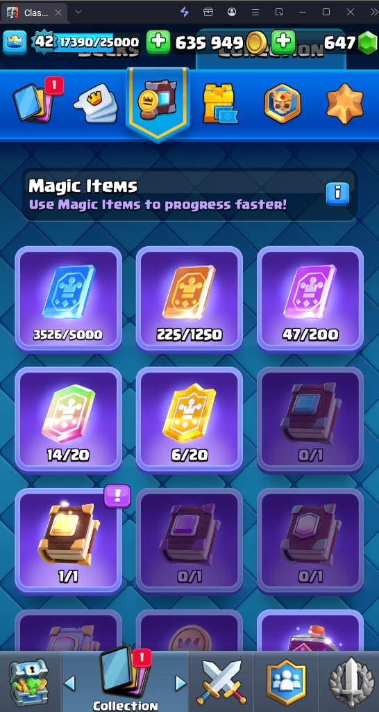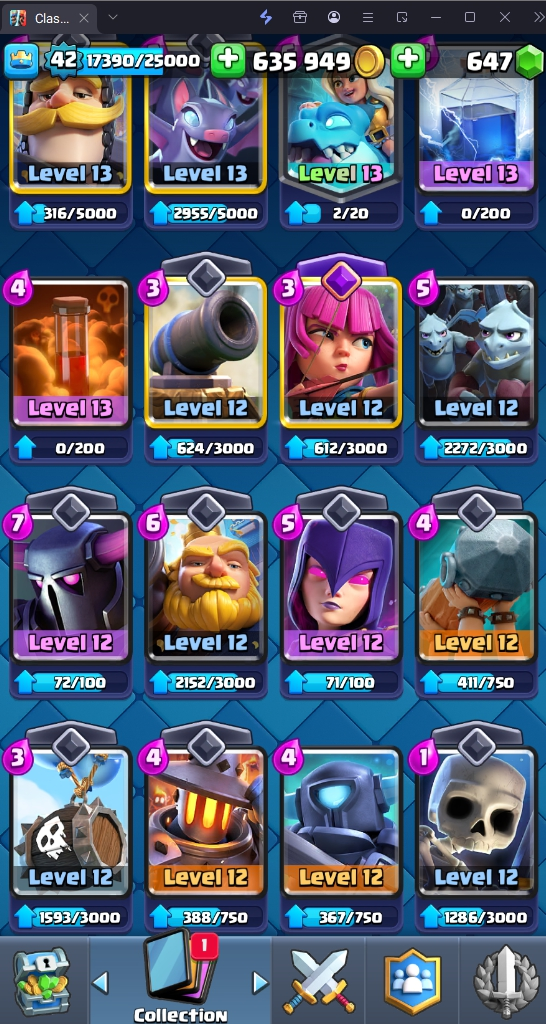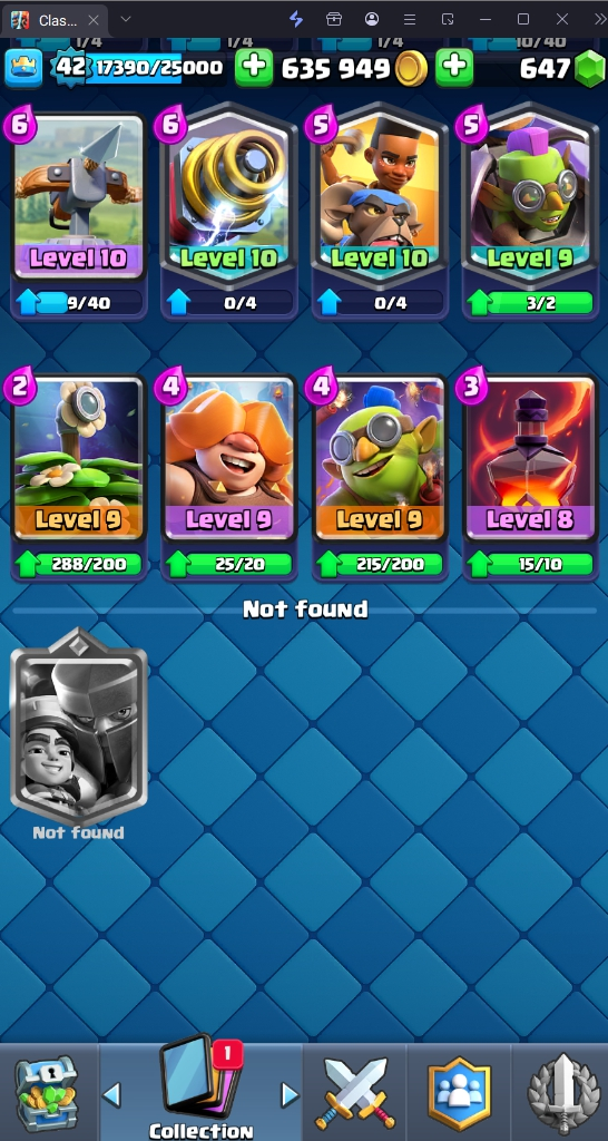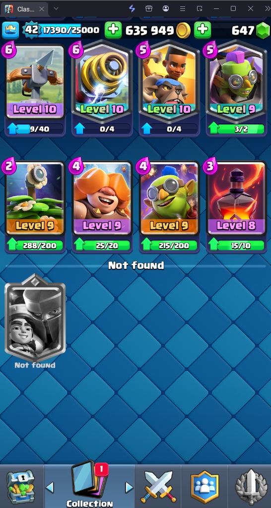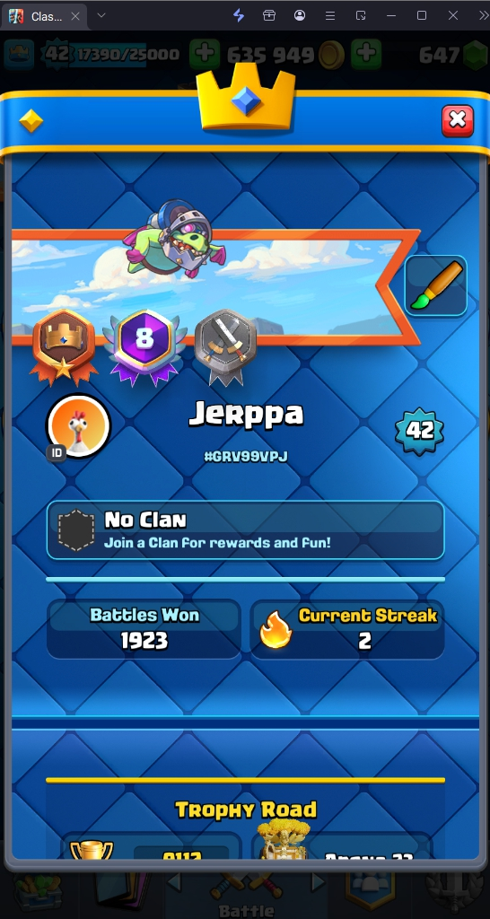 9112 TROPHY 🏆 42 LVL 💯 KT 14 👑 120 CARDS ♦️ 8 MAX CARDS 👑 0 ELITE CARDS 🔮 6 EVO 💯 EMOTE 39 🎭 #GRV99VPJ ⸱ TAG ACCOUNT ♥️