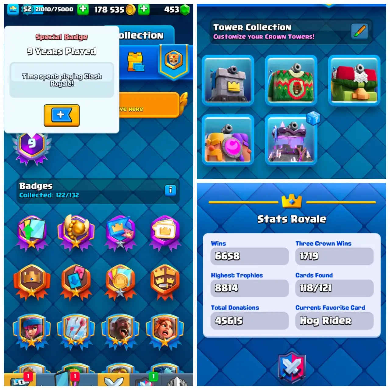 💥👑 Best Cr 9 Year Old 🏹🎁 Lv 52! 🚀🧬 level 14 cards- 23❤️🔥 Elites 4 🐲 54 Emotes 💫🪅 5 RAre Tower Skins💫 🔥 KT 14 📛 453 Gems 🗼 Instant Delivery 🚚