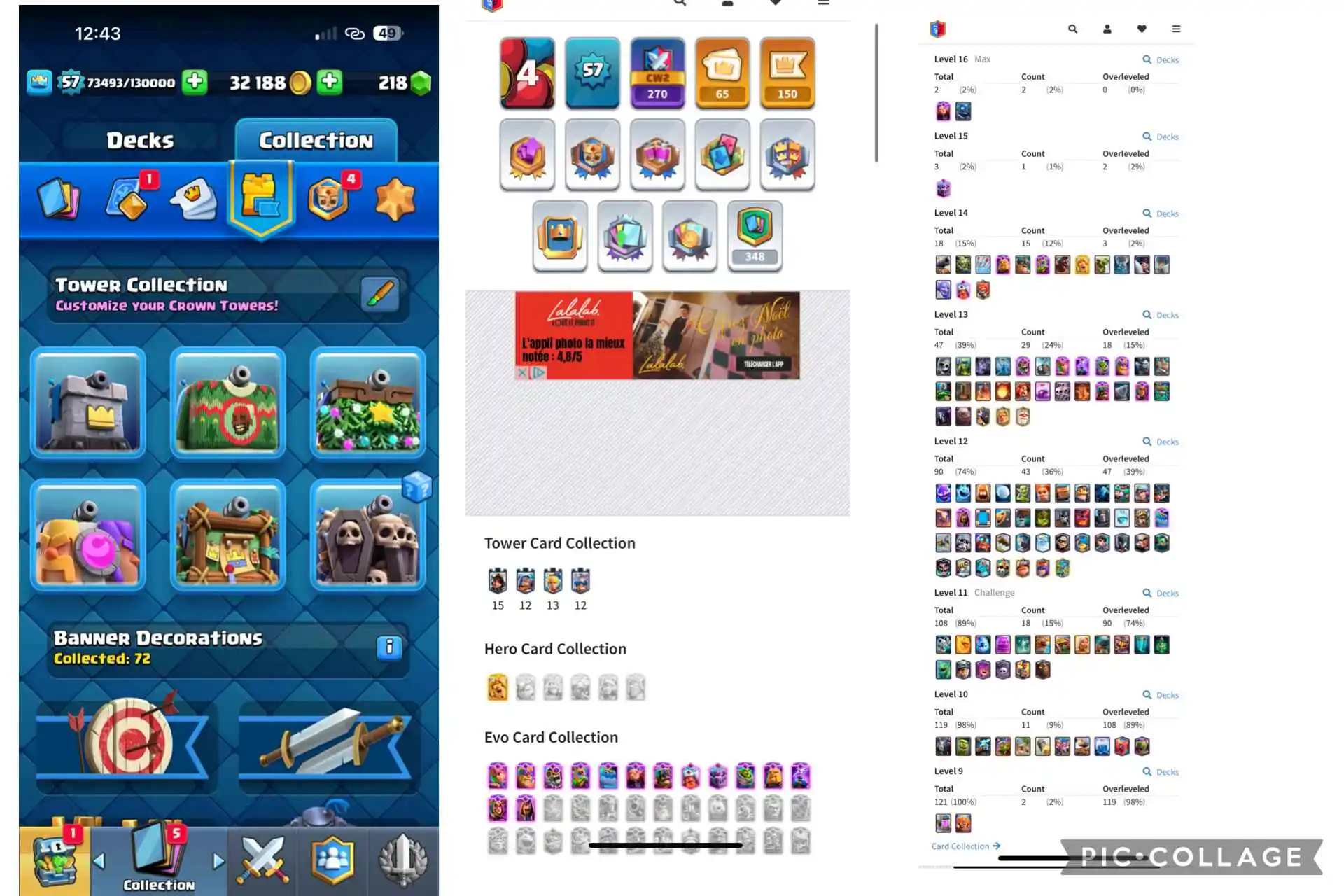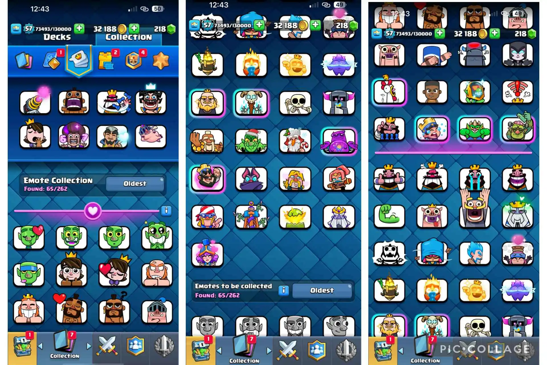 Level[57]-Exclusive Evolution[14x]-Hero card [1]Level16[2x]Level15[3x]-Level14[18x]- unlocked card[120x]-Kt15-Kt Skin[6x]-Cool Emote[65x-Trophy[10000]