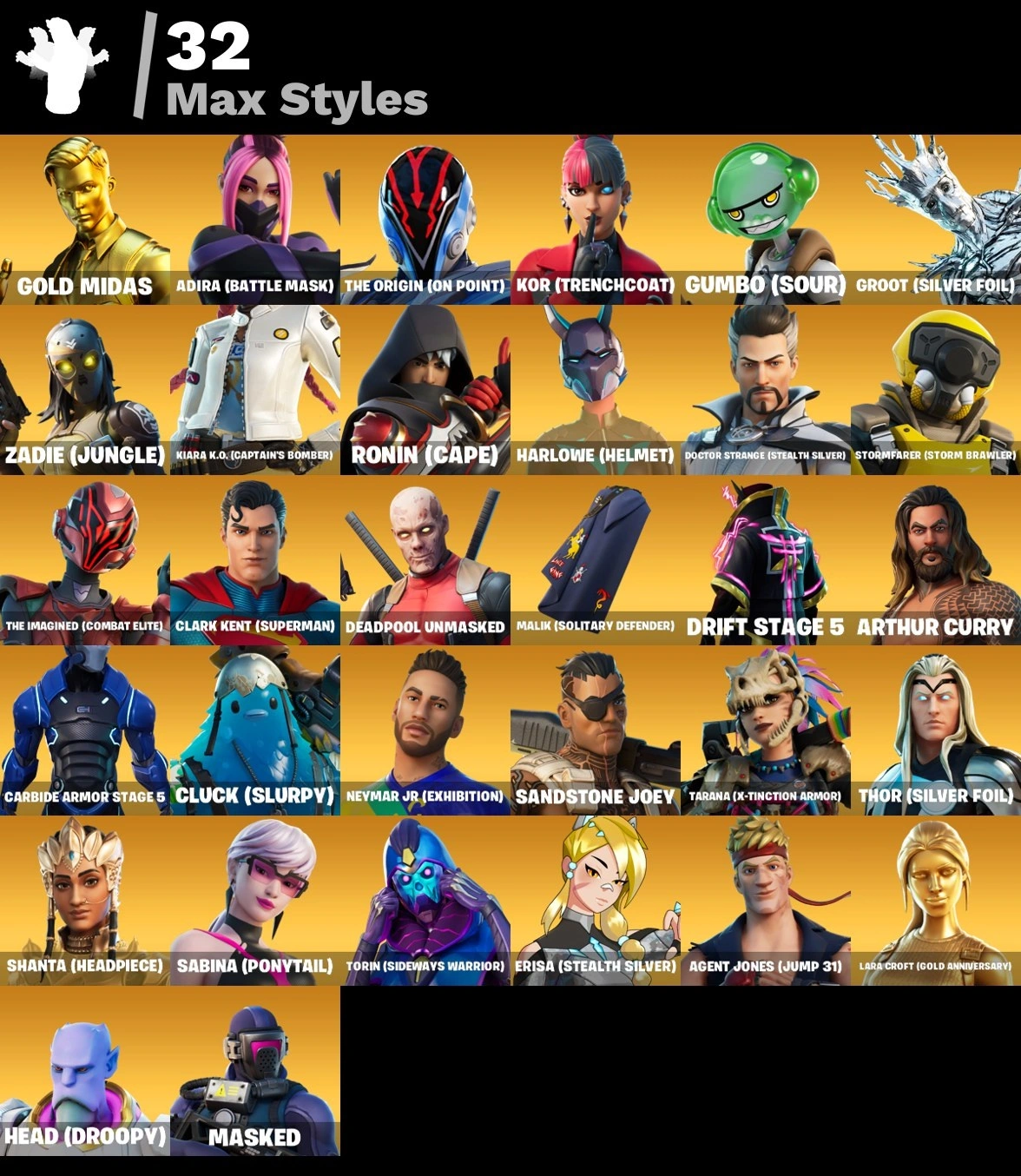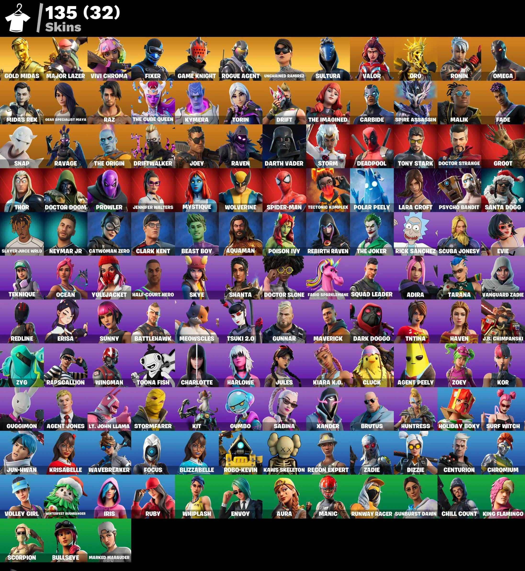 135 skins [PC/XBOX] Unchained Ramirez | Psycho Bandit | Gold Midas | Major Lazer | Vivi Chroma | Fixer | Game Knight | Rogue Agent | Sultura | Rust Bucket | Spider-Man | Kor | Meowscles | Tony Stark | Lara Croft | Vanguard Zadie