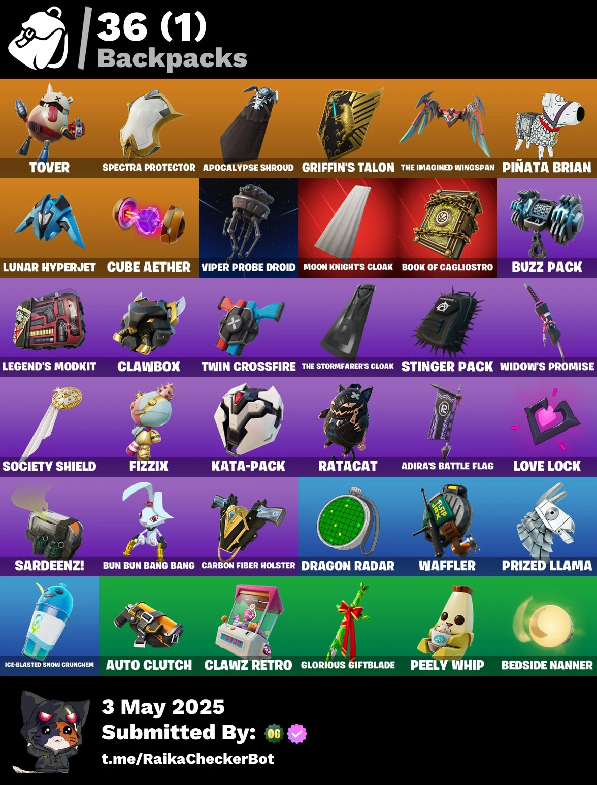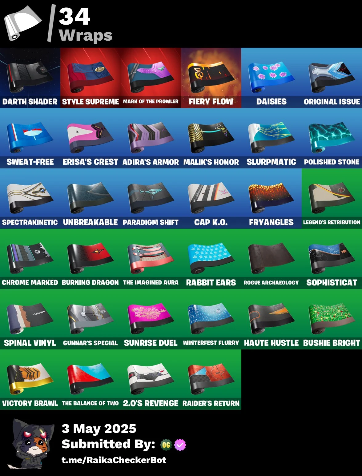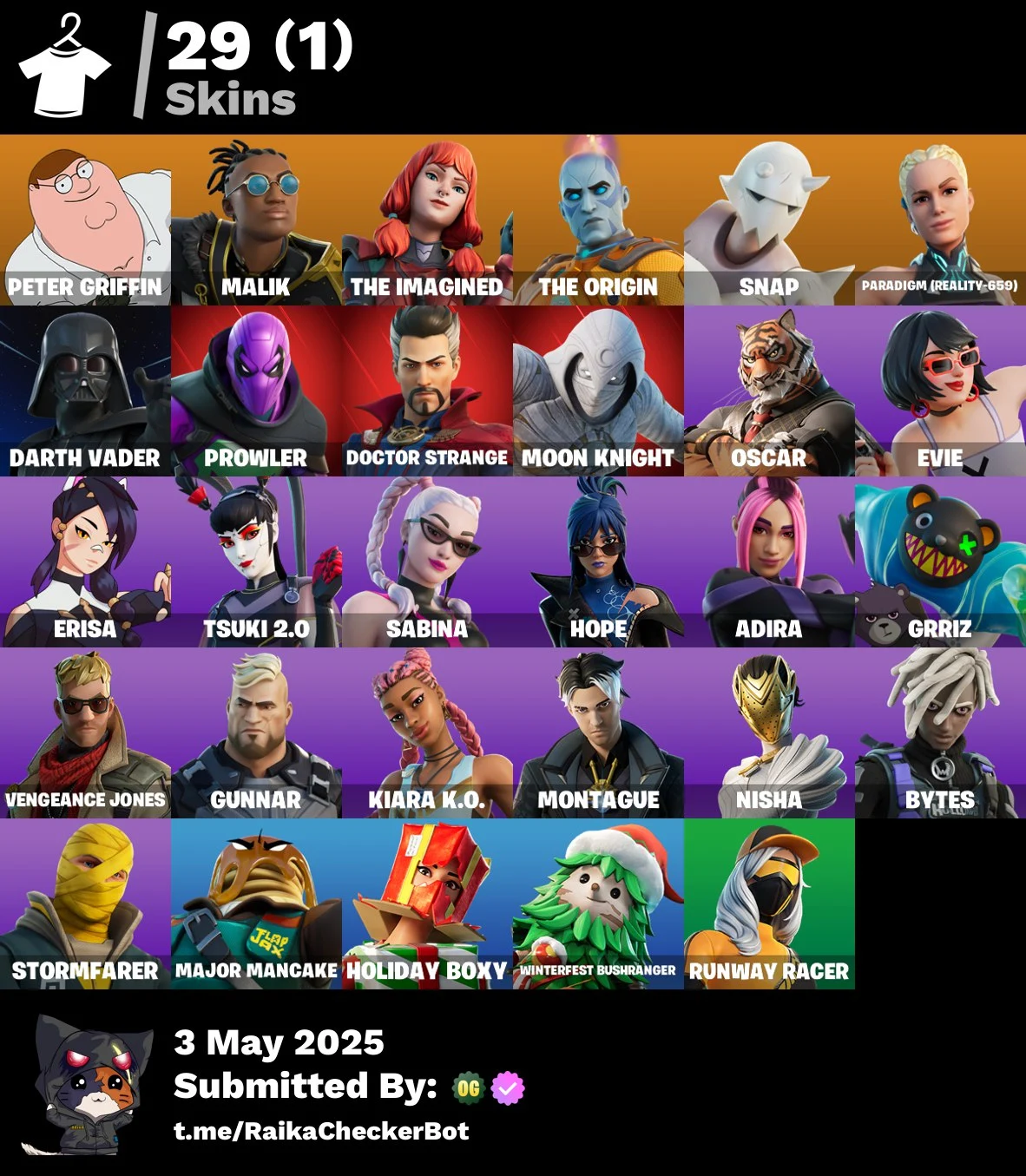 29 skins | Peter Griffin | Malik | The Imagined | The Origin | Snap | Paradigm (Reality-659) | Darth Vader | Prowler | Doctor Strange | 1450 VB