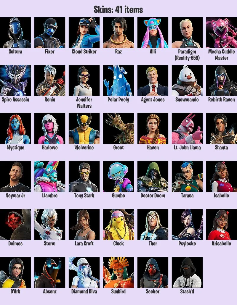 41 Skins|Sultura|Fixer|Cloud Striker|Raz|Alli|Paradigm (Reality-659)|Mecha Cuddle Master|Spire Assassin|Ronin|Jennifer Walters|Polar Peely
