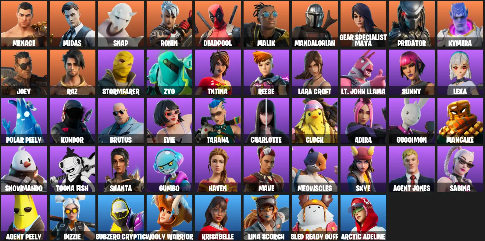 48 skins |Rage|Verve| Gold Midas | Gold Brutus | Gold Meowscles | Lina Scorch | Subzero Cryptic | Malik | Menace | Joey | Predator | Snap | 850 VB