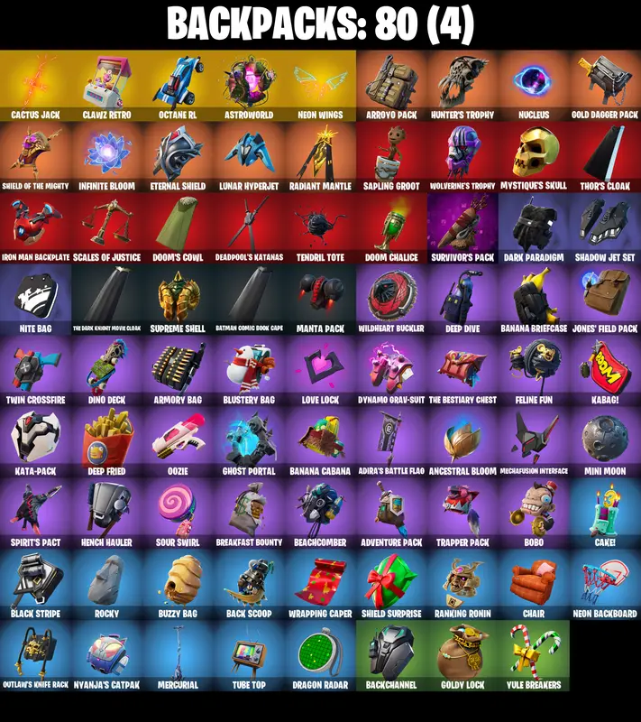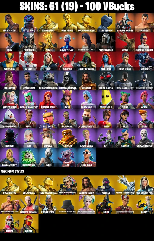 61 SKINS 🔥 Travis Scott | Astro Jack | Lara Croft | Skull Trooper | Harley Quinn | Jules | Deadpool | Mystique | Gold Brutus | Gold Midas | Gold Meowscles | Tart Tycoon | Eternal Knight | Menace | Fade | Predator | Oro | Galaxy Scout