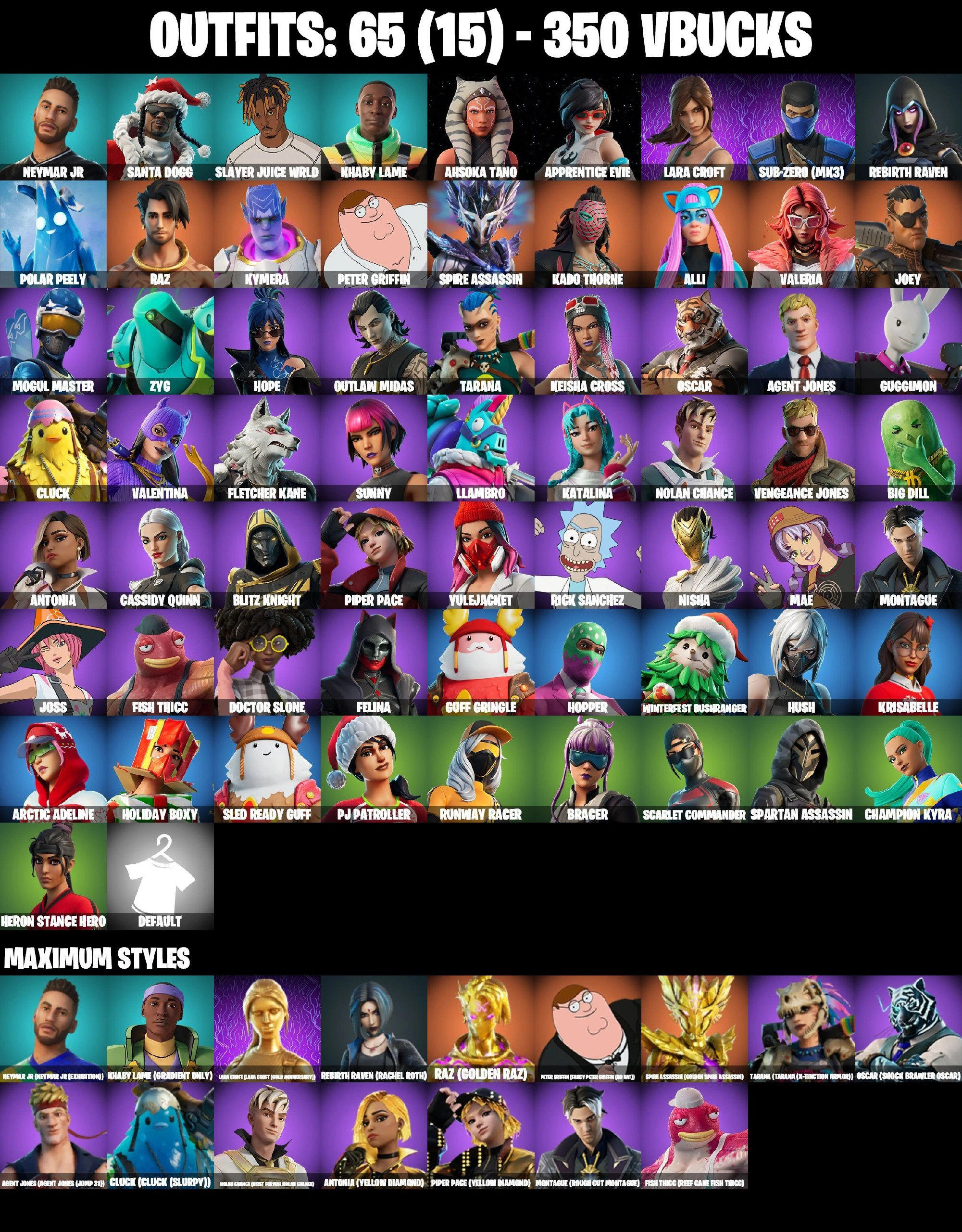 65 SKINS | GOLDEN LARA CROFT | RACHEL ROTH | JABBA SWITCHWAY | GET GRIDDY | SUB-ZERO MK3 | AHSOKA TANO | APPRENTICE EVIE | OUTLAW MIDAS | STAR WAND | SCARLET COMMANDER | CAN PLAY ON PSN,XBOX,PC,NINTENDO,MOBILE | 350 VBUCKS | FULL