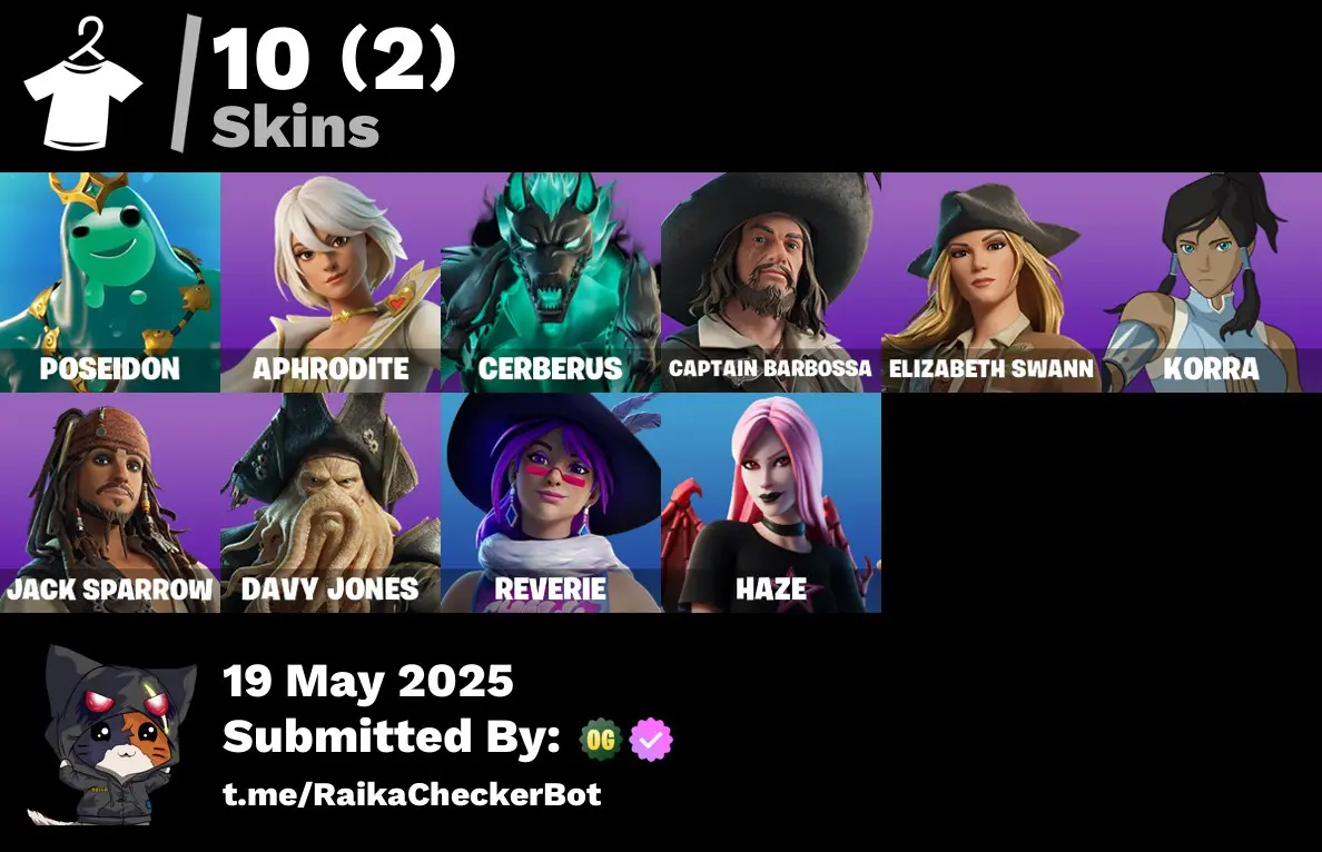 [PC] 10 Skins | Poseidon | Aphrodite | Cerberus | Captain Barbossa | Elizabeth Swann | Korra | Jack Sparrow | Davy Jones | Reverie | Haze | FN19