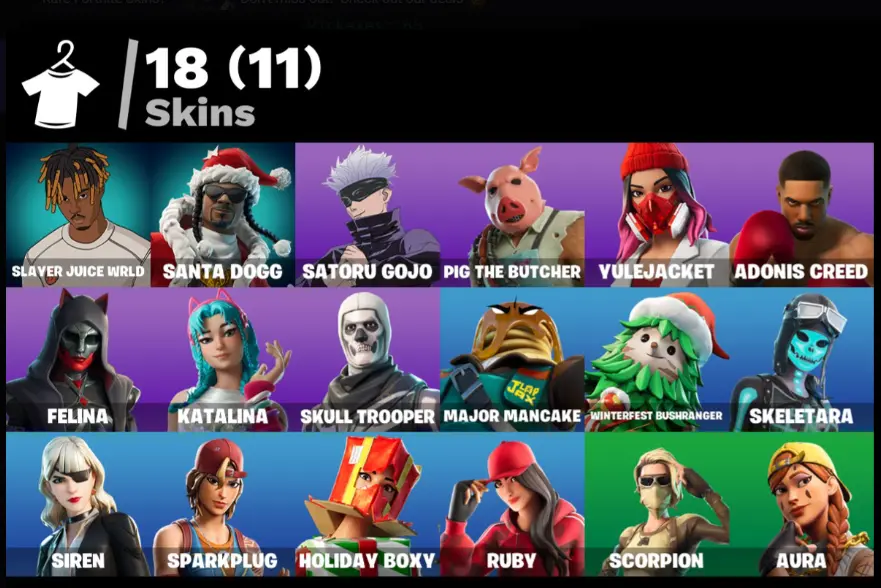[PC] 18 skins | Slayer Juice WRLD | Santa Dogg | Satoru Gojo | Pig the Butcher | Yulejacket | Adonis Creed | Felina | Katalina | Skull Trooper | 400 VB