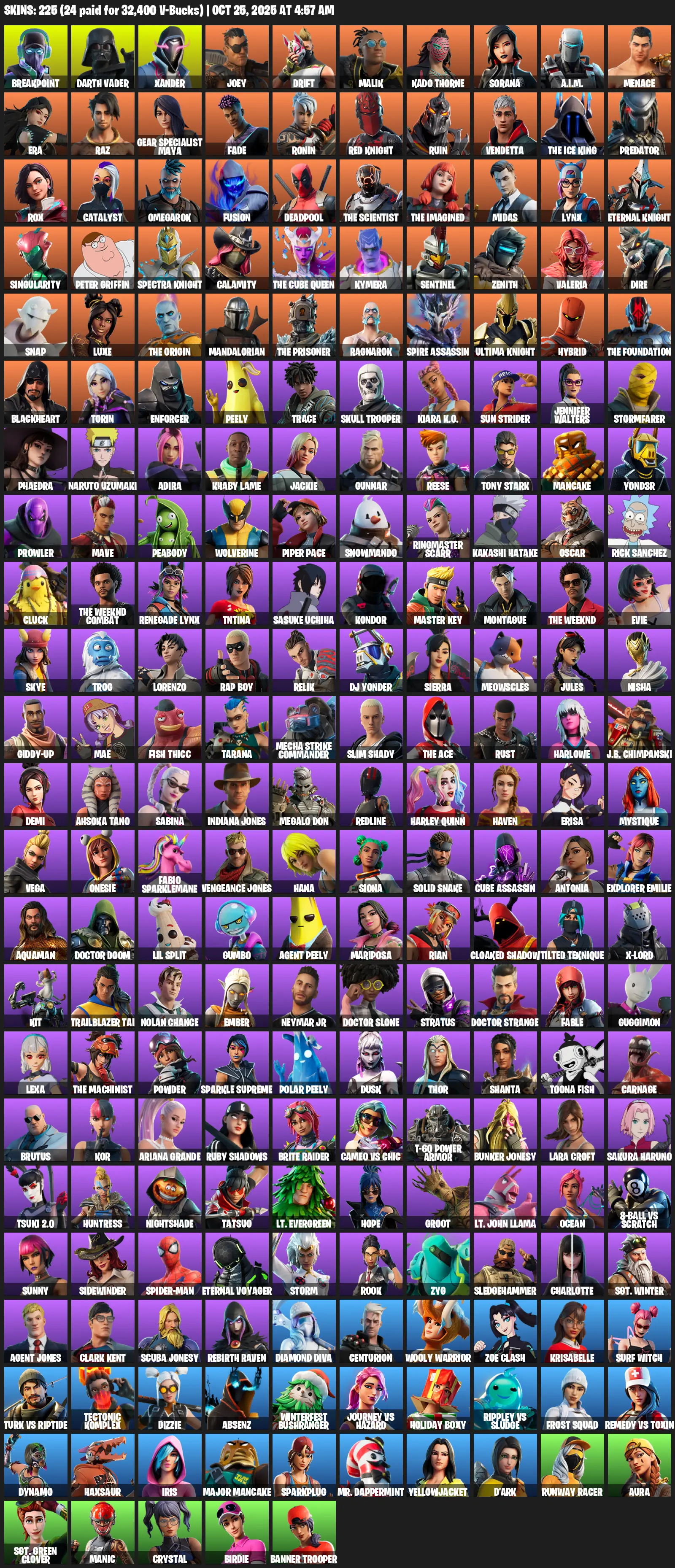 [PC] | 225 skins | 1850 V-bucks | Lara Croft | Breakpoint | Darth Vader | Xander | Joey | Drift | Malik | Kado Thorne | Sorana | #SSG9151 | #MBFN