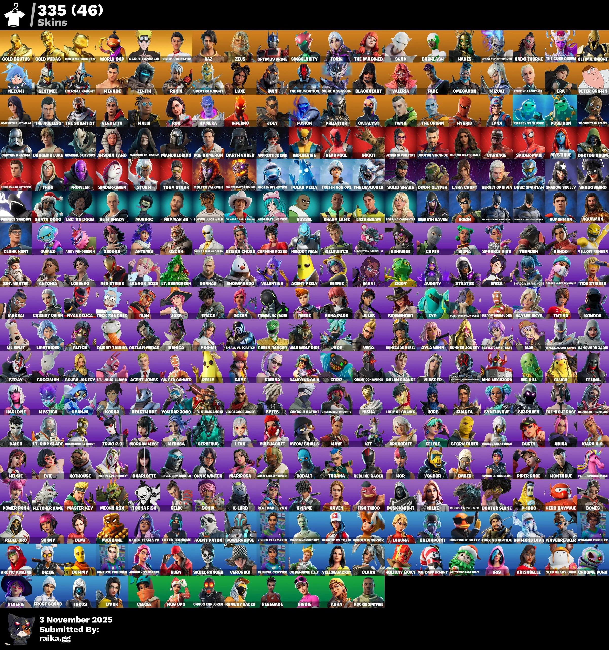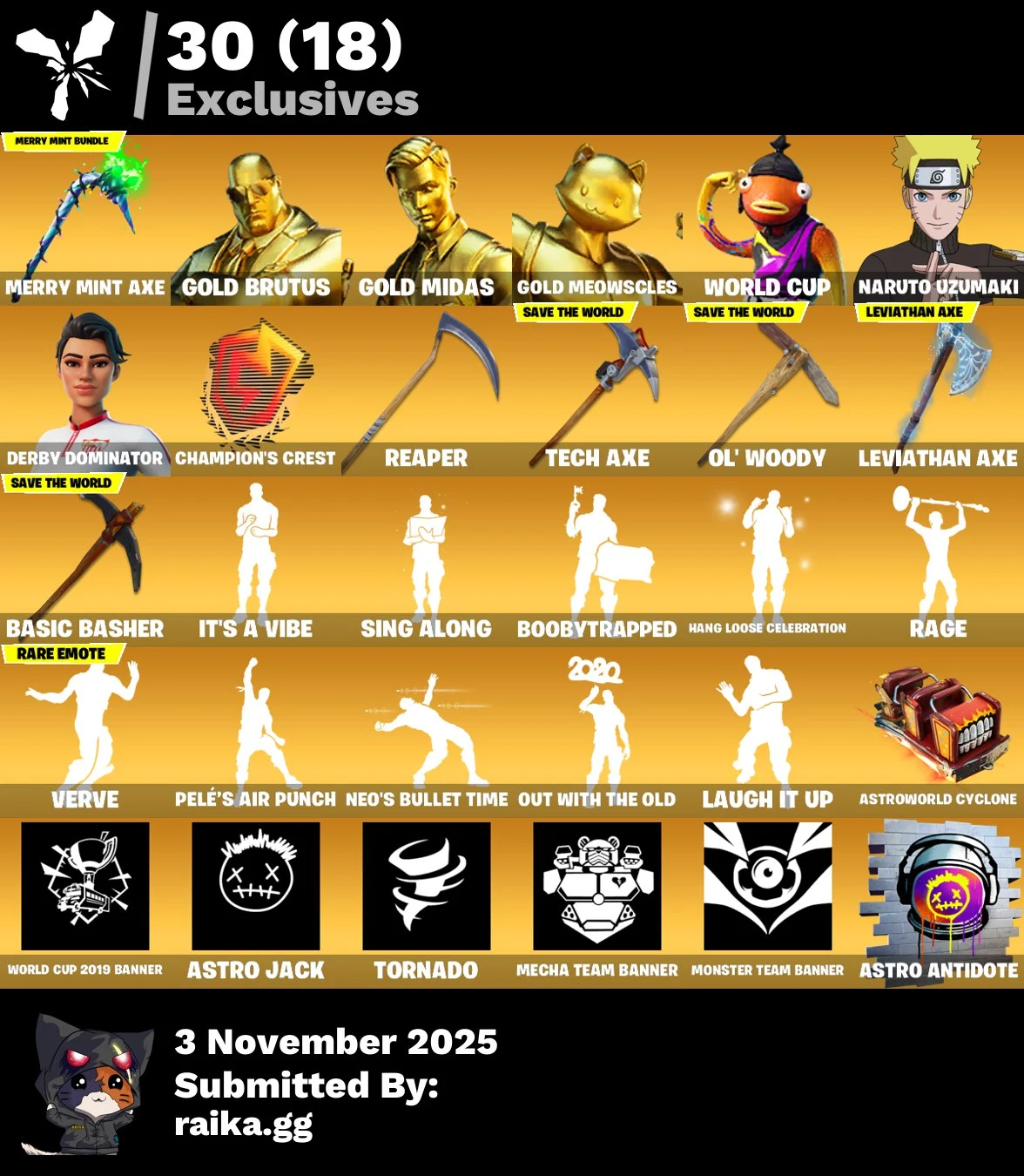 [PC | PSN | XBOX] 335 skins | Gold Brutus | Merry Minty Axe | Leviathan Axe | Gold Midas | Gold Meowscles | WORLD CUP | Naruto Uzumaki | Derby Dominator | Raz | Zeus | Optimus Prime | 1750 VB