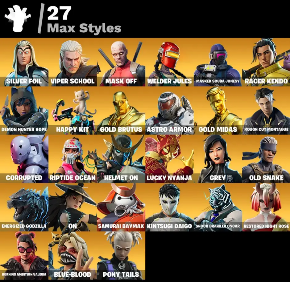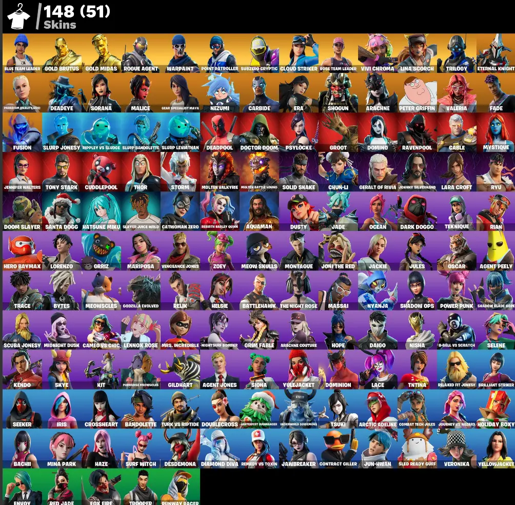 (PC PSN XBOX) 148 skins | OG STW | CHUN-LI / LARA CROFT / RYU / REBIRTH HARLEY QUINN / Blue Team Leader | Gold Brutus | Gold Midas | Rogue Agent | Point Patroller | Subzero Cryptic | Cloud Striker | Vivi Chroma | 900 VB