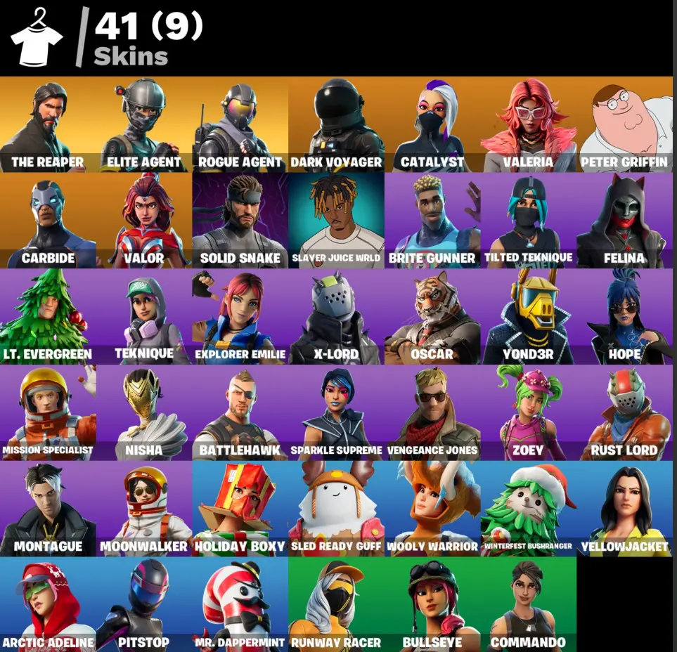 (PC PSN XBOX) 41 skins | The Reaper | Elite Agent | Rogue Agent | Dark Voyager | Catalyst | Valeria | Peter Griffin | Carbide | Valor | Solid Snake | 450 VB / TAKE THE L / TAKE THE LLF