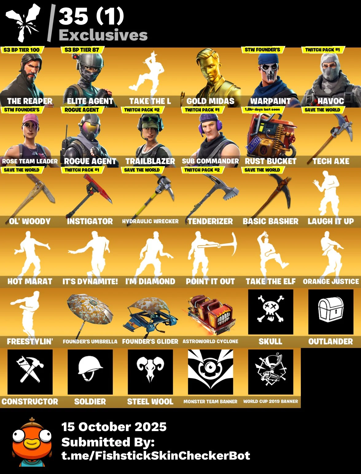 [PC/PSN/XBOX] 105 skins | OG STW | The Reaper | Elite Agent | Gold Midas | Havoc | Rogue Agent | Trailblazer | Sub Commander | Hybrid | 1400 VB