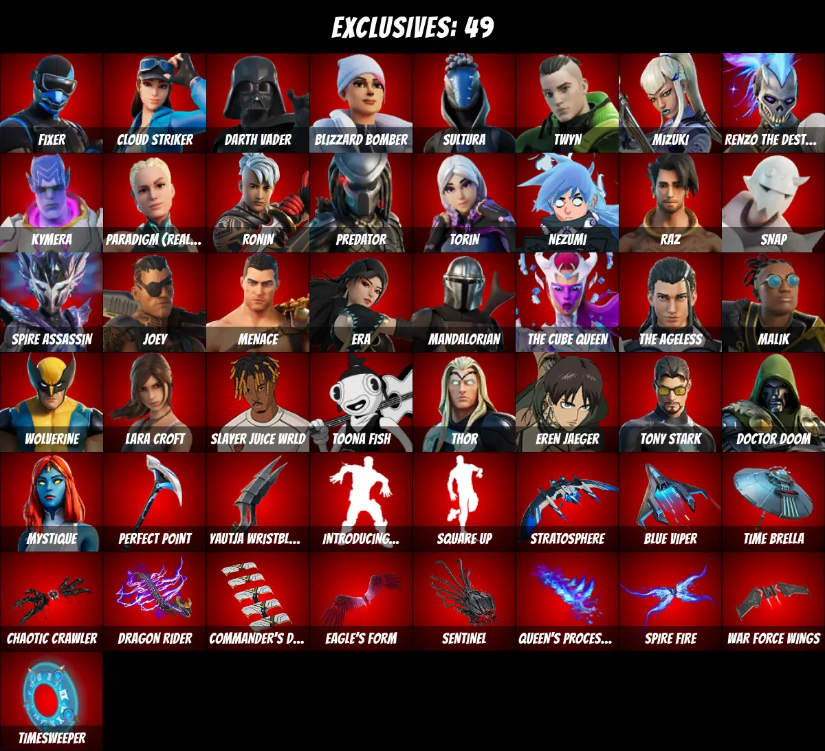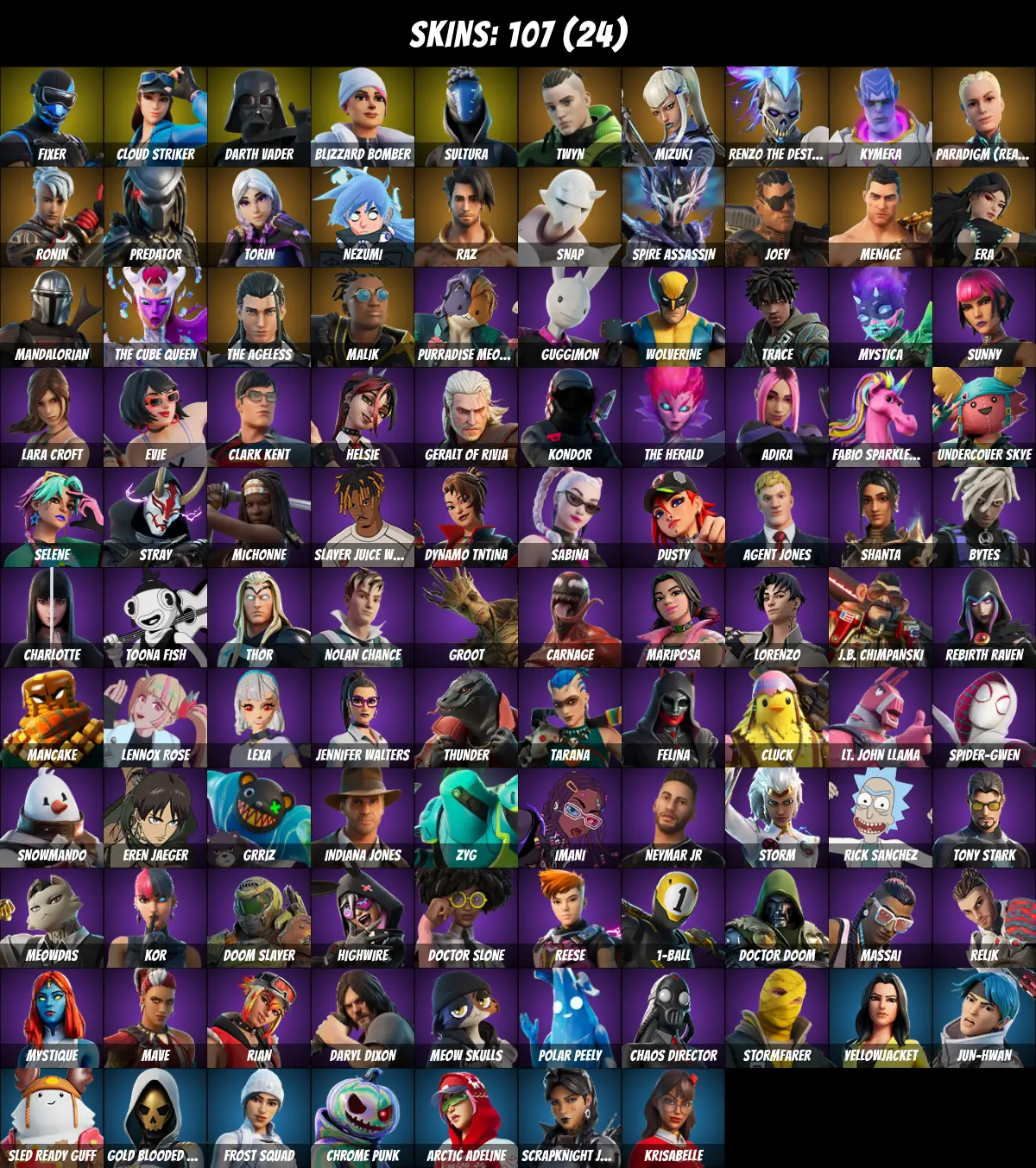 ⚡PC/PSN/XBOX⚡ 107 skins 💎 Rick Sanchez 💎 Kor 💎 Tony Stark 💎 Lara Croft 💎 Mandalorian 💎 Spider-Gwen 💎 Darth Vader 💎 The Ageless 💎 Renzo the Destroyer 💎 Toona Fish 💎 Thor 💎 Snap 💎 Wolverine 💎 Eren Jaeger 💎 Mystique 💎 Fixer 💎 Cloud Striker 💎 2350 V-Bucks 💎