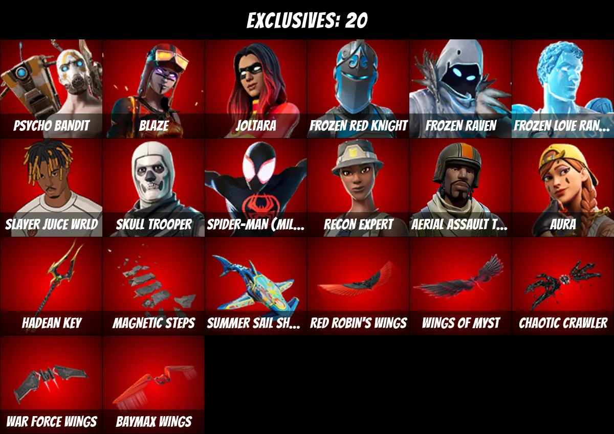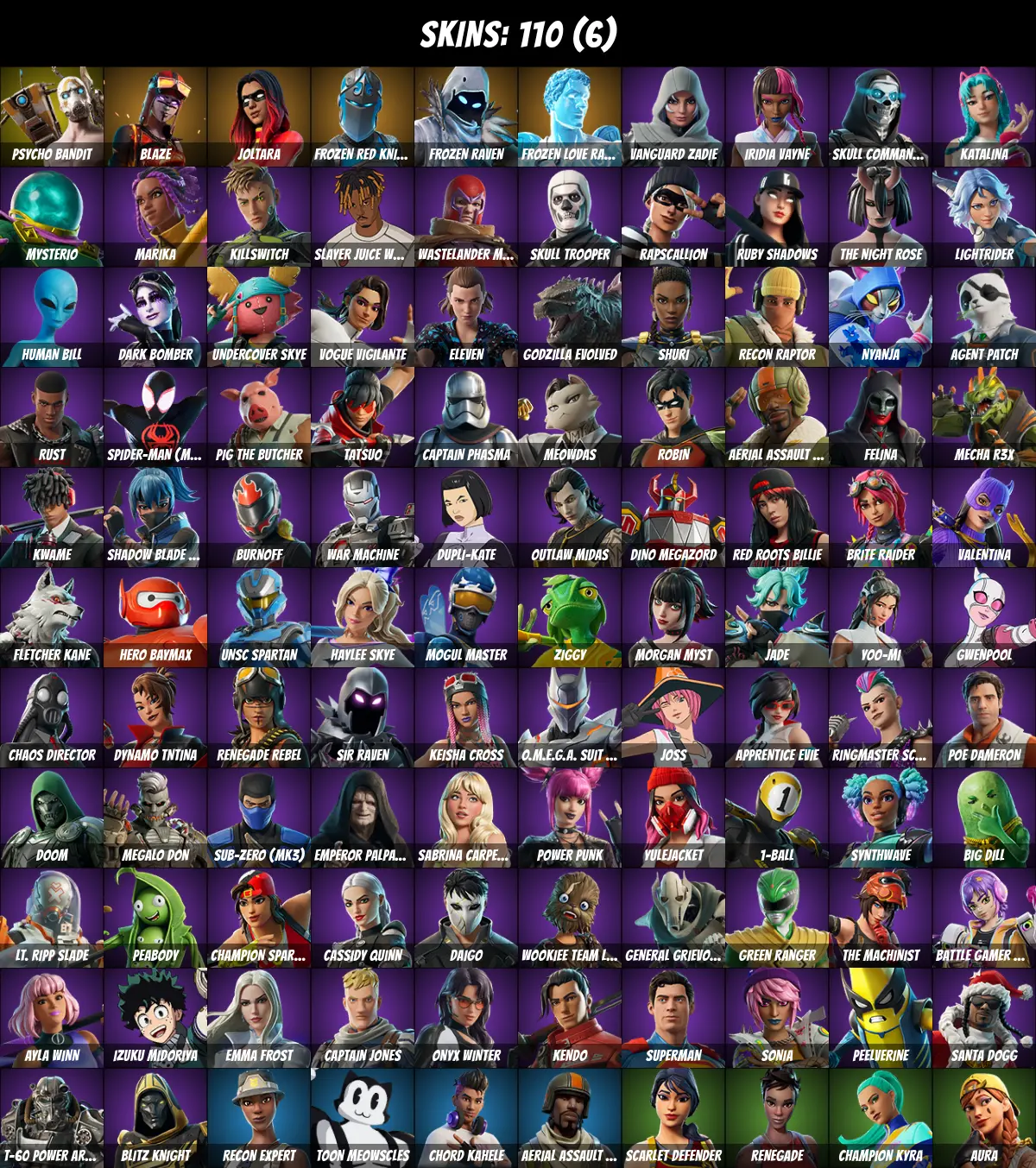 ⚡PC/PSN/XBOX⚡ 110 skins 💎 Aerial Assault Trooper 💎 Skull Trooper 💎 Psycho Bandit 💎 Spider-Man (Miles Morales) 💎 Gwenpool 💎 Joltara 💎 Blaze 💎 Aura 💎 Recon Expert 💎 Peelverine 💎 Slayer Juice Wrld 💎 Frozen Love Ranger 💎 Frozen Red Knight 💎 250 V-Bucks 💎