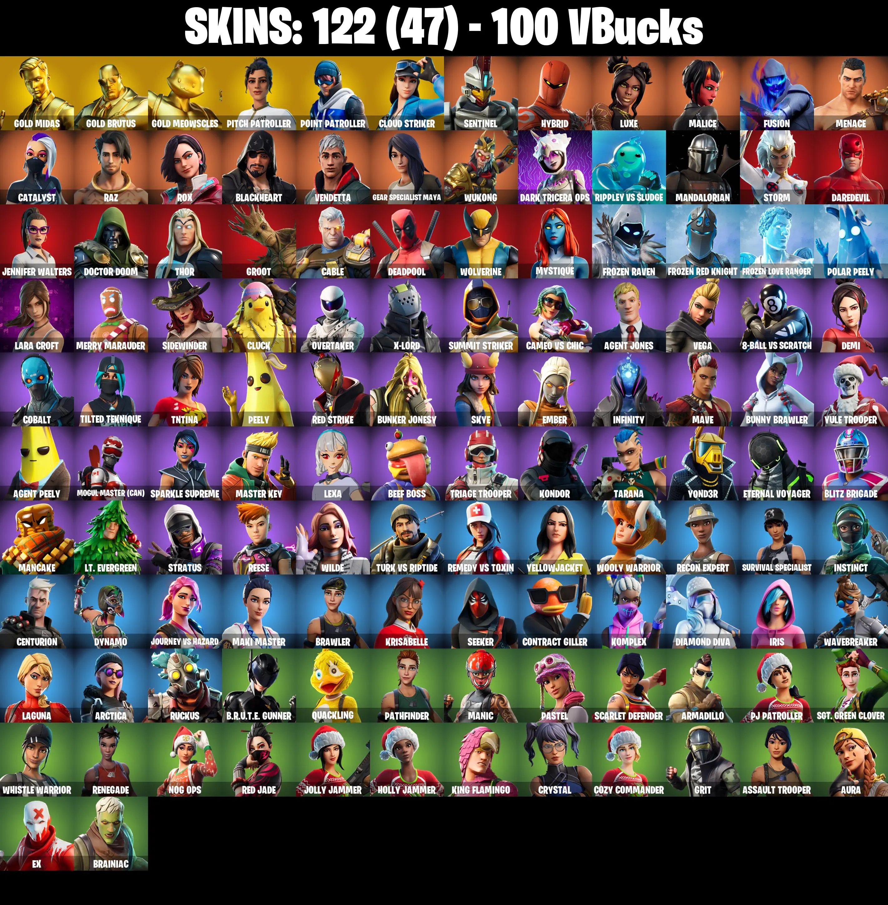 PC/PSN/XBOX ♨️122 skins ✨ Lara Croft ✨ Deadpool ✨ Gold Midas ✨ Gold Brutus ✨ Gold Meowscles ✨ Luxe ✨ Peely ✨ Vendetta ✨ Fusion ✨ Menace ✨ #B818