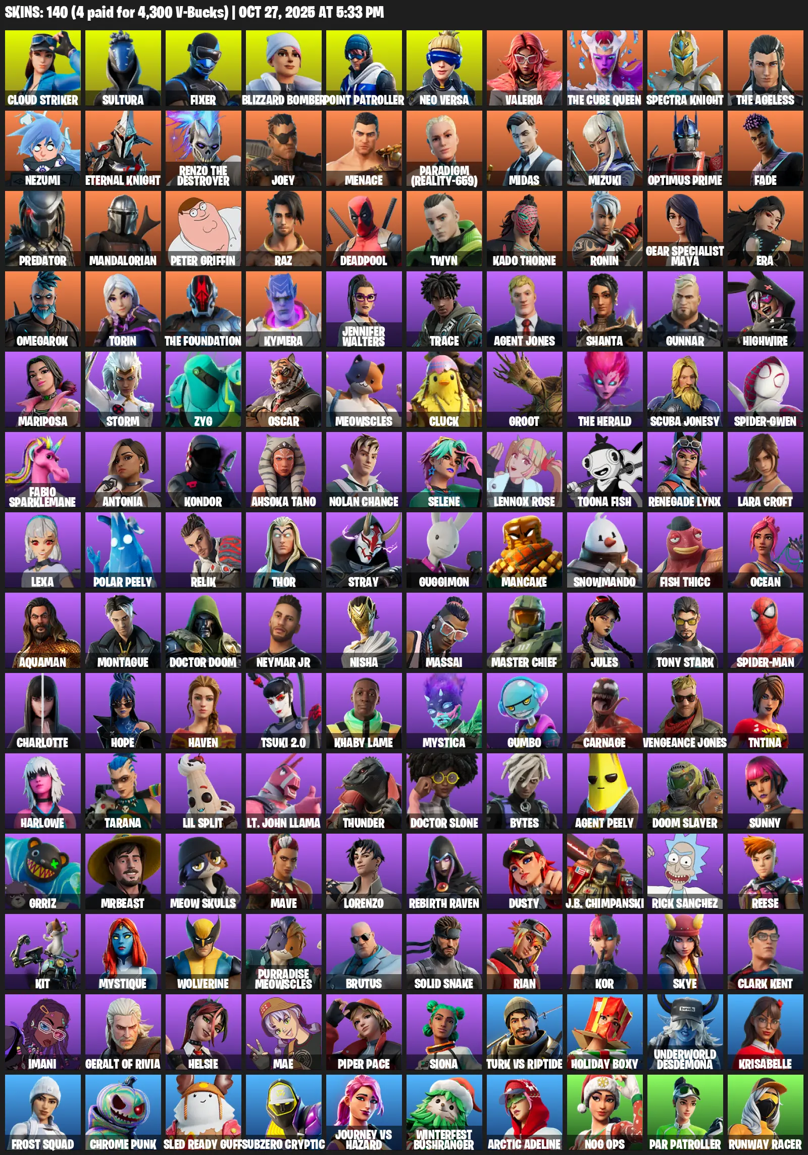 [PC/PSN/XBOX] | 140 skins | Lara Croft | Cloud Striker | Sultura | Fixer | Blizzard Bomber | Point Patroller | Neo Versa | Valeria | #EUN9160 | #MBFN