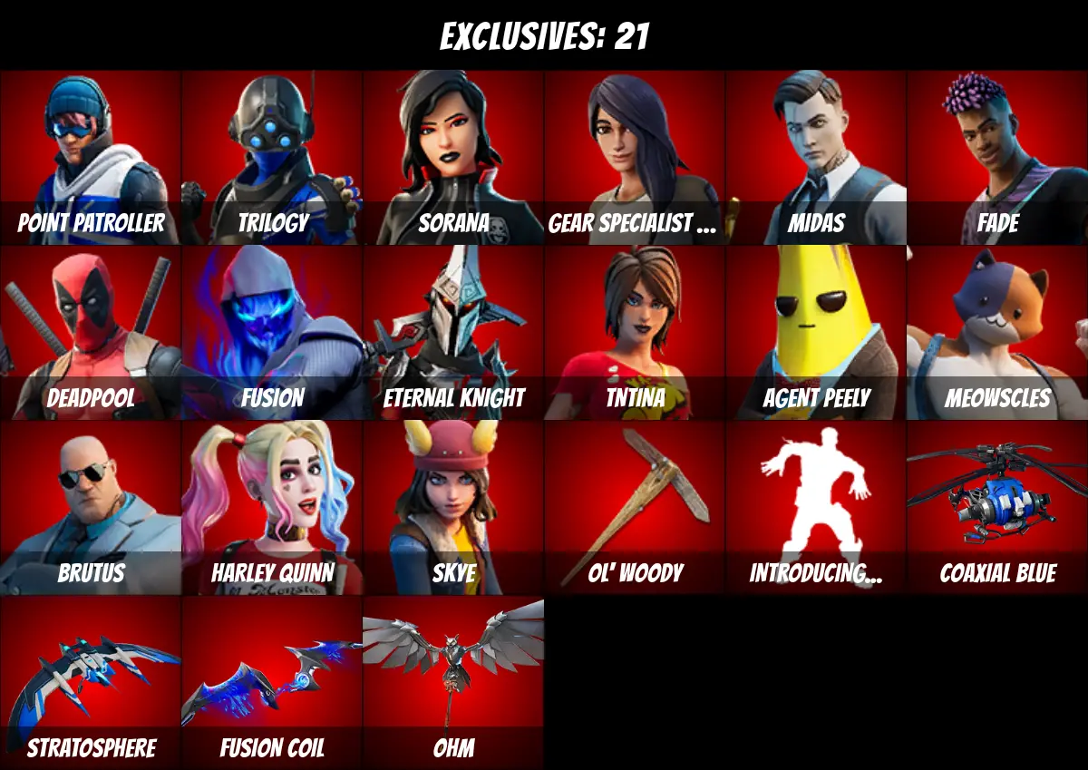 โกPC/PSN/XBOXโก 34 skins ๐ Deadpool ๐ Harley Quinn ๐ Midas ๐ Jules ๐ Agent Peely ๐ Meowscles ๐ TNTina ๐ Brutus ๐ Skye ๐ Point Patroller ๐ Gear Specialist Maya ๐ Eternal Knight ๐ Sorana ๐ Fusion ๐ Trilogy ๐ Fade ๐ Ol' Woody ๐ Ocean ๐ Aquaman ๐ 150 V-Bucks ๐