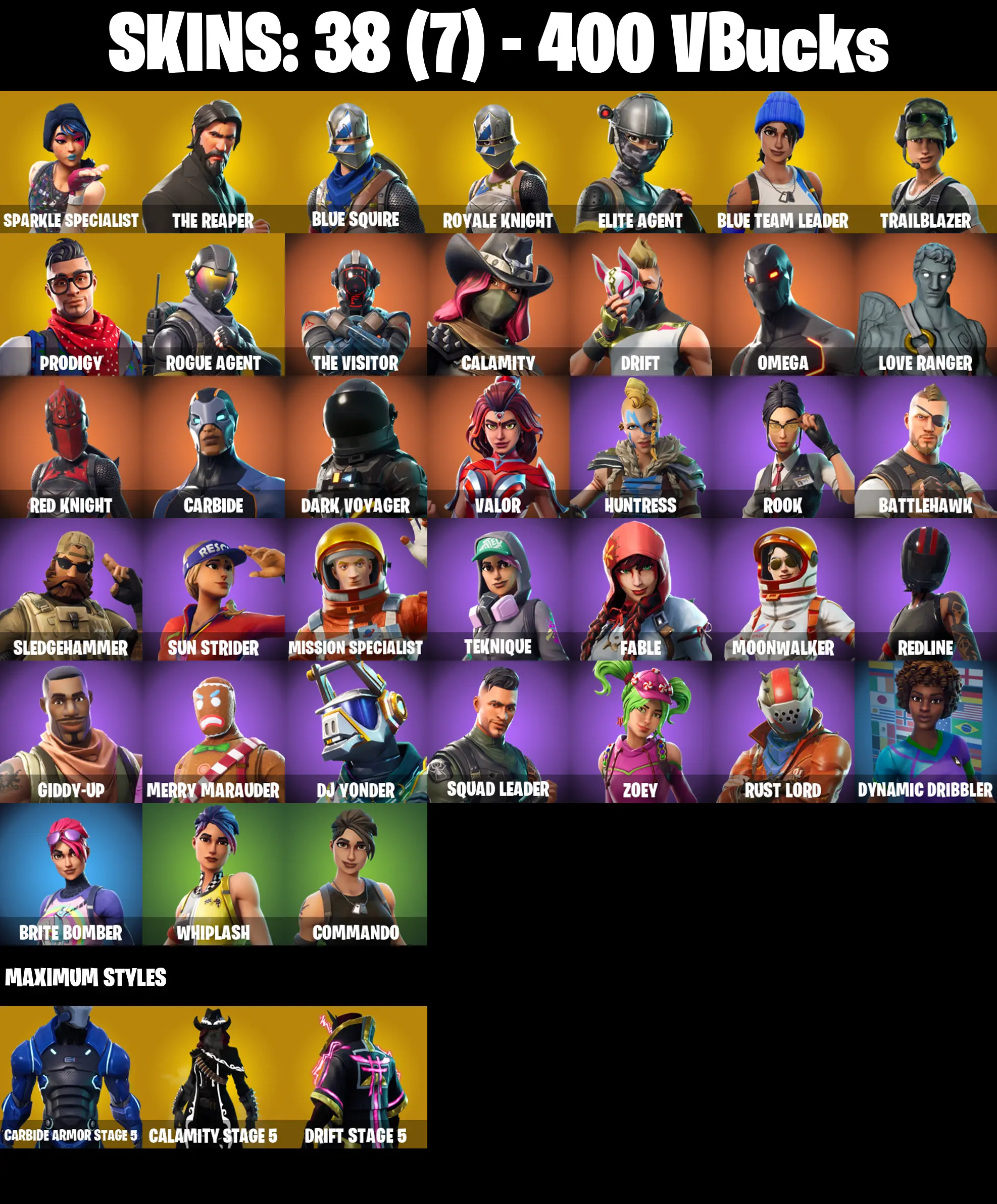 🔮 [PC/PSN/XBOX] 38 SKINS | Sparkle Specialist, The Reaper, Blue Squire, Royale Knight, Elite Agent, Blue Team Leader, Take The L, Trailblazer, Prodigy, Rogue Agent, The Visitor, Calamity, Drift, Omega, Love Ranger, Red Knight, Carbide, Dark Voyager, Valor