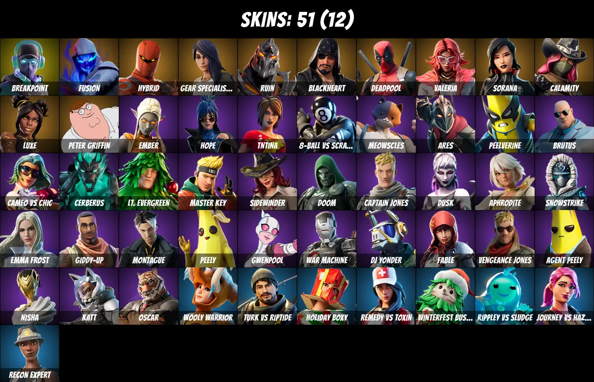 ⚡PC/PSN/XBOX⚡ 51 skins 💎 Gwenpool 💎 Deadpool 💎 Peely 💎 Agent Peely 💎 Calamity 💎 Meowscles 💎 Recon Expert 💎 TNTina 💎 Brutus 💎 Peelverine 💎 Peter Griffin 💎 Valeria 💎 Hybrid 💎 Gear Specialist Maya 💎 Sorana 💎 Fusion 💎 Breakpoint 💎 Ruin 💎 250 V-Bucks 💎