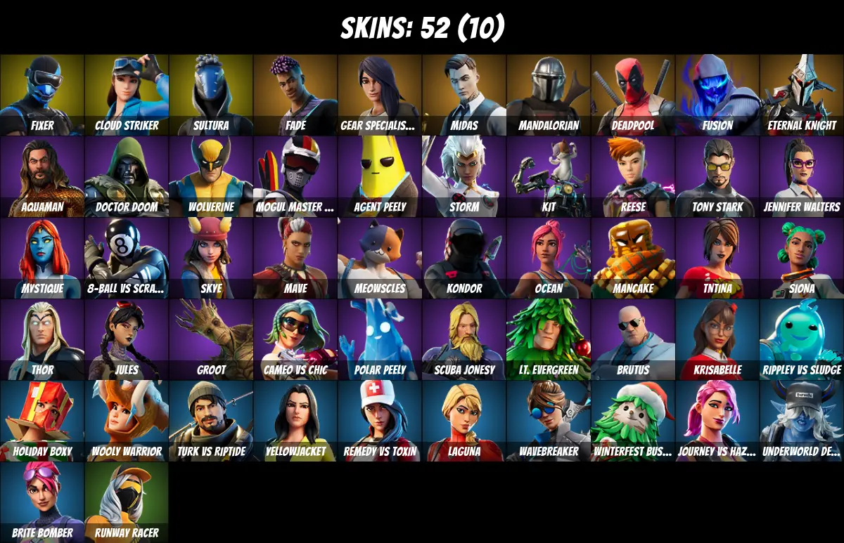 โกPC/PSN/XBOXโก 52 skins ๐ Deadpool ๐ Tony Stark ๐ Midas ๐ Mandalorian ๐ Jules ๐ Agent Peely ๐ Meowscles ๐ Thor ๐ TNTina ๐ Brutus ๐ Wolverine ๐ Mystique ๐ Doctor Doom ๐ Skye ๐ Fade ๐ Eternal Knight ๐ Sultura ๐ Fixer ๐ Cloud Striker ๐ 800 V-Bucks ๐