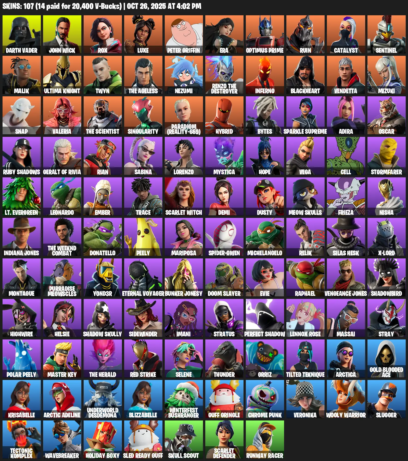 [PC/XBOX/PSN] 107 Skins | Darth Vader | John Wick | Rox | Luxe | Peter Griffin | Era | Optimus Prime | Ruin | Catalyst | Sentinel | Malik | Ultima Knight | Twyn | The Ageless | Nezumi | Renzo the Destroyer | Inferno | Blackheart | Vendetta | Mizuki | Snap