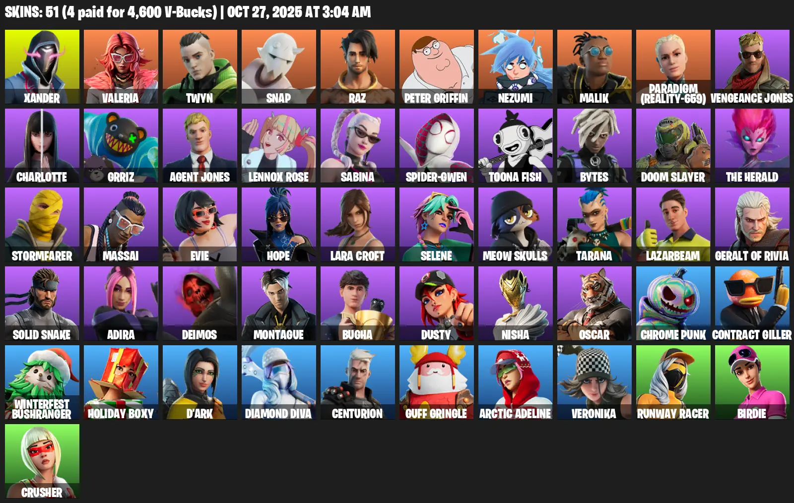 [PC/XBOX/PSN] 51 Skins | Xander | Valeria | Twyn | Snap | Raz | Peter Griffin | Nezumi | Malik | Paradigm (Reality-659) | Vengeance Jones | Charlotte | Grriz | Agent Jones | Lennox Rose | Sabina | Spider-Gwen | Toona Fish | Bytes | Doom Slayer