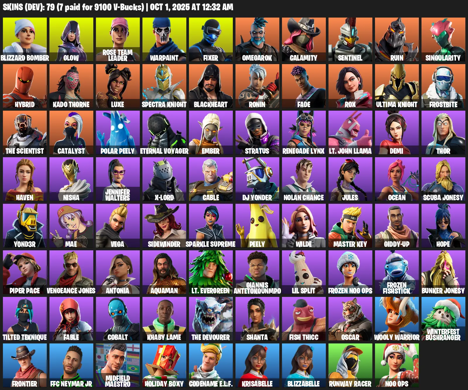 [PC/XBOX/PSN] 79 Skins | Blizzard Bomber | Glow | Rose Team Leader | Warpaint | Fixer | Omegarok | Calamity | Sentinel | Ruin | Singularity | Hybrid | Kado Thorne | Luxe | Spectra Knight | Blackheart | Ronin | Fade | Rox | Ultima Knight | Frostbite