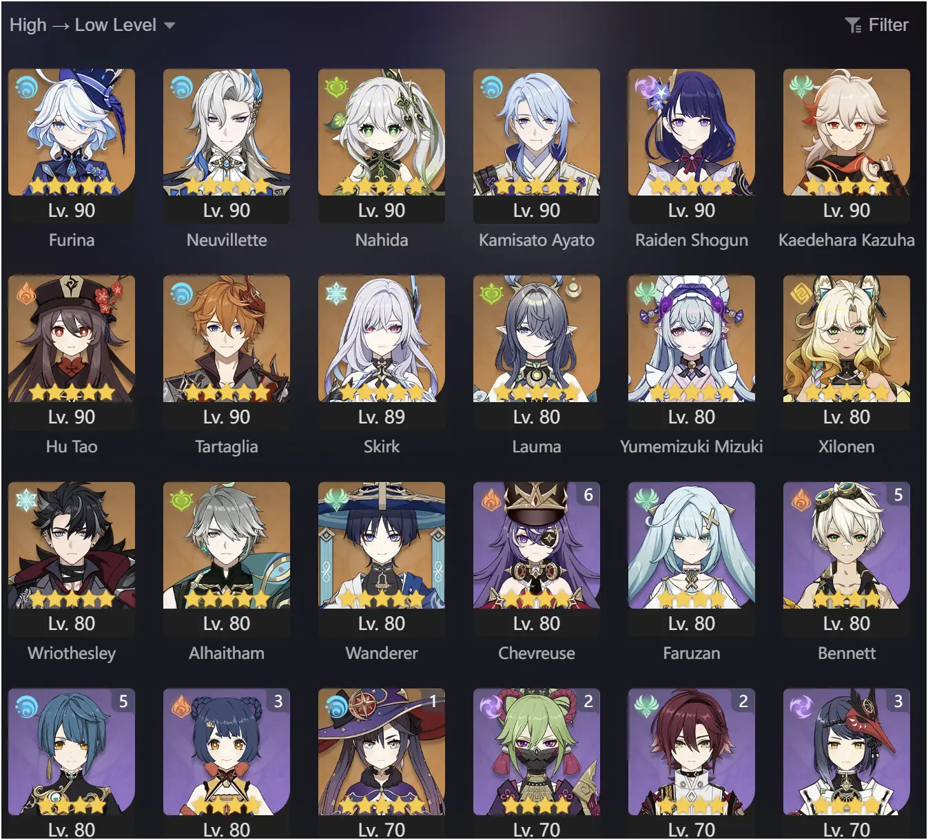 Furina neuvillette nahida ayato raiden kazuha hutao child skirk lauma xilonen wriothesley alhaitham wanderer ar55+