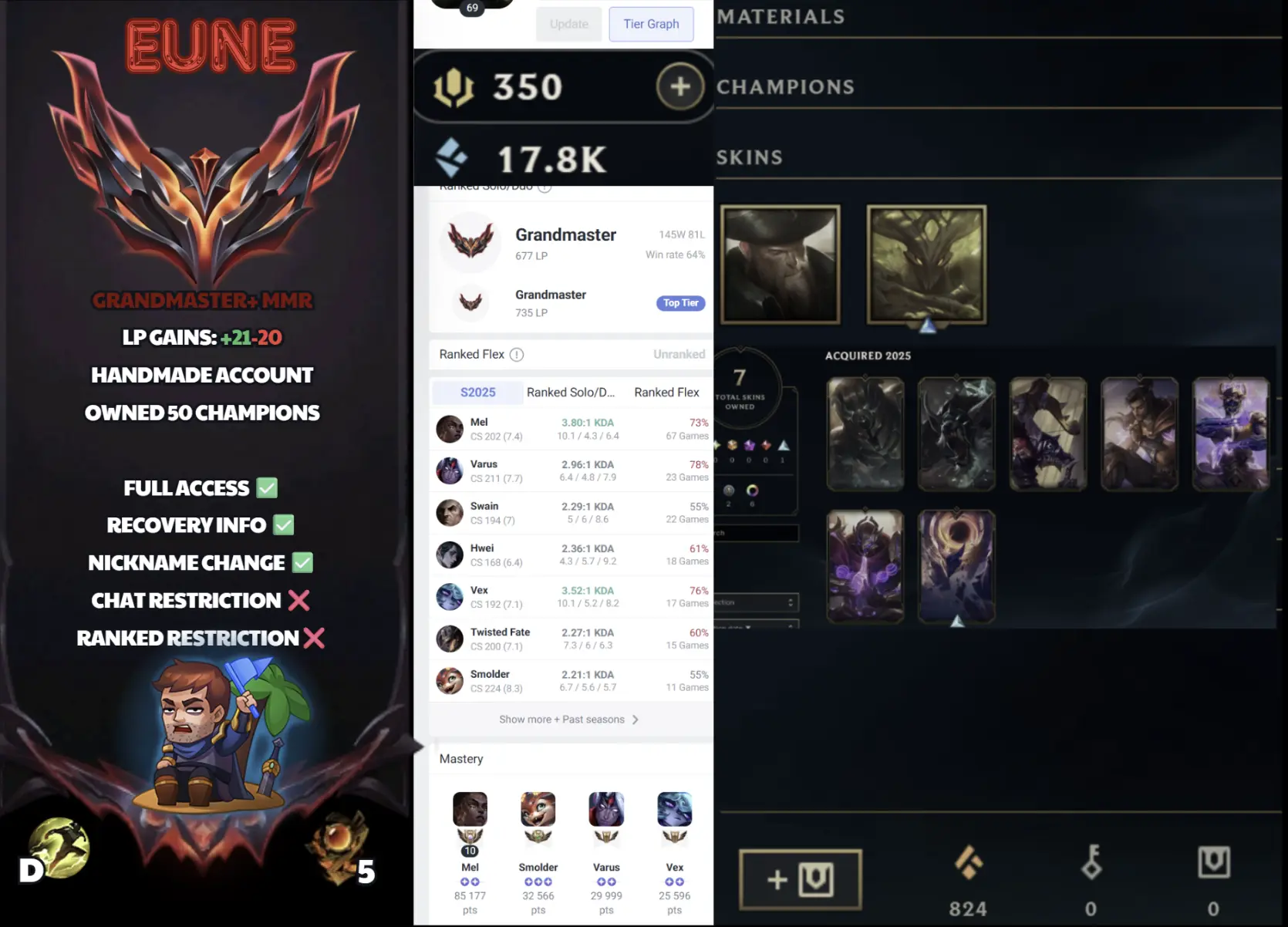 ๐ EUNE ๐ Handlevel โธฑ Mid Main โก Grandmaster I (670+ LP) โจ WR:64% ๐ฅ 62 Champs โธฑ 7 Skins โพ๏ธ Lifetime Ownership ๐ง Full Access Account โ