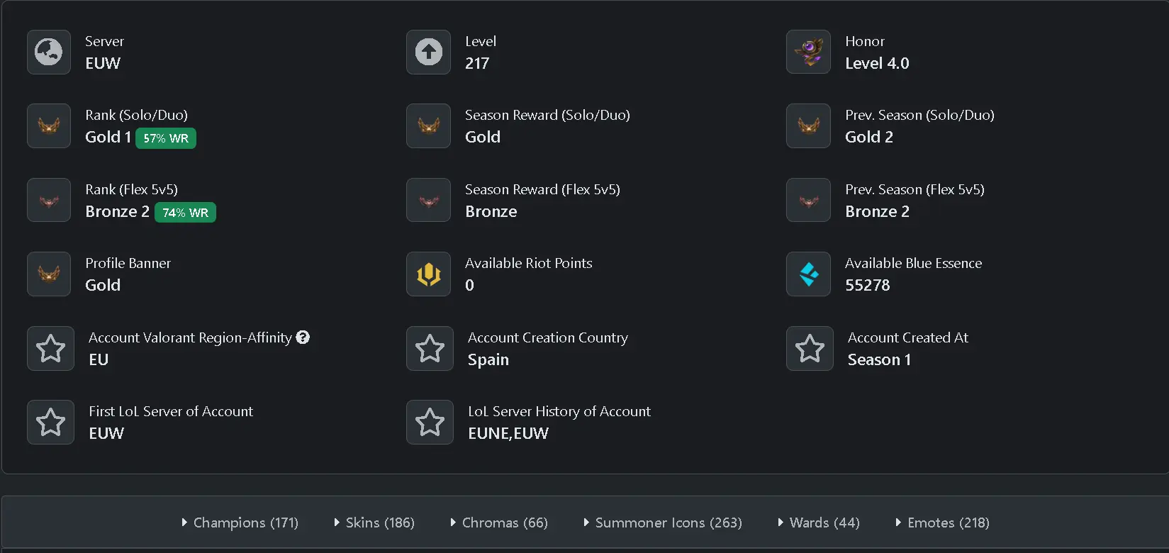 🌎 Region: EUW🔱S15SP3 GOLD I🔱55K BE❄ High Quality LOL Account ⸱ ✅️Changeable Email ✅️ 171 champions🔱186 skins 🔱 ⸱ ✈Instant Delivery⭐FLANKESSTORE⭐