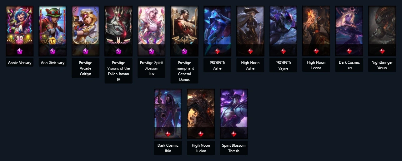 Silver 1┃119 skins┃171 Champs┃(6 Mythic) Prestige Spirit Blossom Lux Prestige Arcade Caitlyn Prestige Visions of the Fallen Jarvan IV Prestige Triumphant General Darius High Noon Leona PROJECT: Vayne Dark Cosmic Jhin