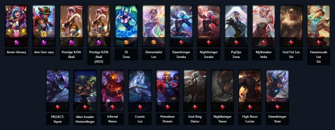 UnRanked┃139 skins┃171 Champs┃(4 Mythic) Prestige K/DA Akali Infernal Nasus Cosmic Lux Heavenscale Lee Sin Nightbringer Yasuo Nightbringer Soraka High Noon Lucian