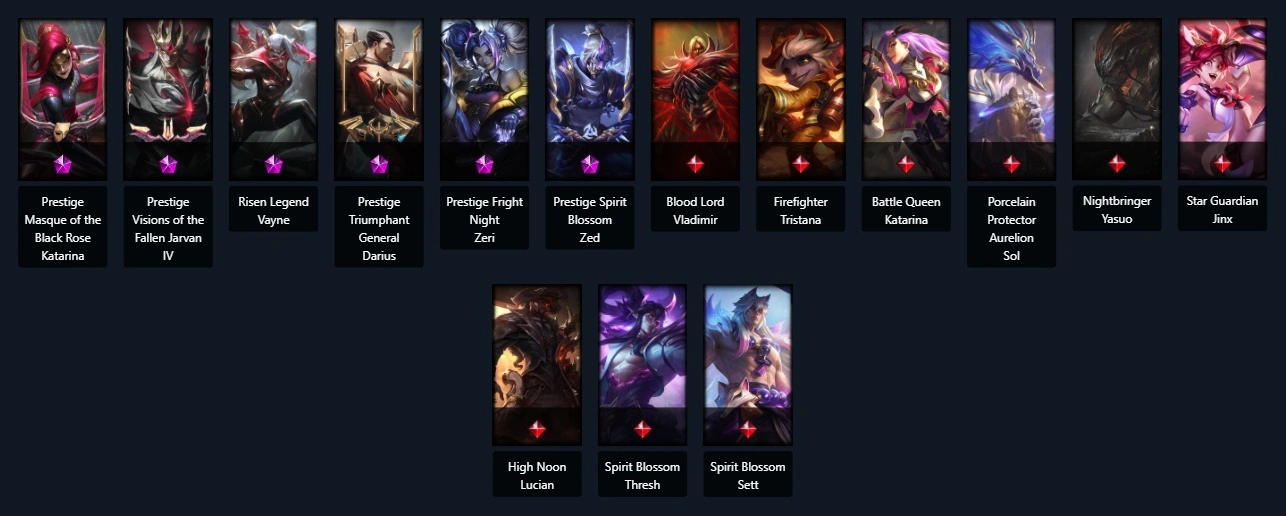 UnRanked┃67 skins┃118 Champs┃(6 Mythic) Risen Legend Vayne Prestige Fright Night Zeri Prestige Spirit Blossom Zed Prestige Visions of the Fallen Jarvan IV Prestige Triumphant General Darius Firefighter Tristana High Noon Lucian