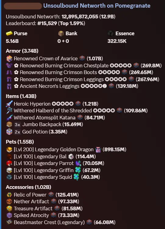 Solo Profile⭐14B Networth ⸱ 5.16B Purse | 778 MP | 24 Minion Slots | 67 Collections Maxed | Many Pets❗13B Unsoulbound
