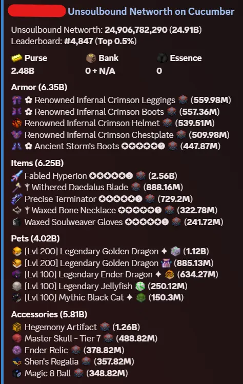 SOLO PROFILE⭐25B Networth | 2.5B Purse | 1103 MP | Many Pets | 23 Minion Slots | 26 Collections Maxed❗25B UNSOULBOUND