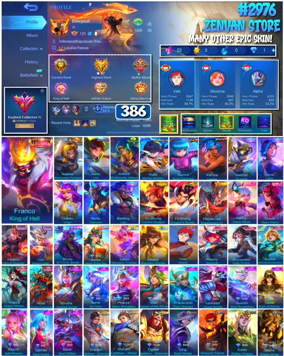 #2976 🔥 386 Skins 🔥 Legend Franco 🔥 Collector Natalia 🔥 Attack on Titan Levi 🔥 Mistbender Aldous 🔥 Aspirant Ruby 🔥 Prime Yu Zhong 🔥 Stun Brody 🔥 KoF Karina, Aurora 🔥 Many Limited 🔥 Many Zodiac 🔥 Many Epic 🔥 Safe Account ✅