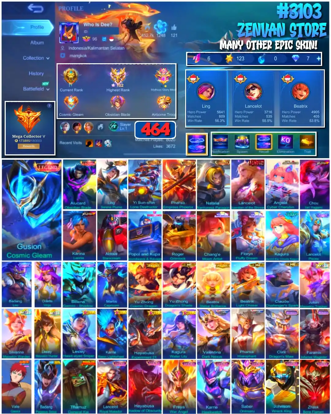 #3103 🔥 464 Skins 🔥 Legend Gusion & Alucard 🔥 Collector Ling, Yin Sun Shin, Pharsa & Natalia 🔥 Kinsin Lance 🔥 Aspirant Angela 🔥 Transformers Aldous 🔥 Many Limited 🔥 Many Epic 🔥 Safe Account