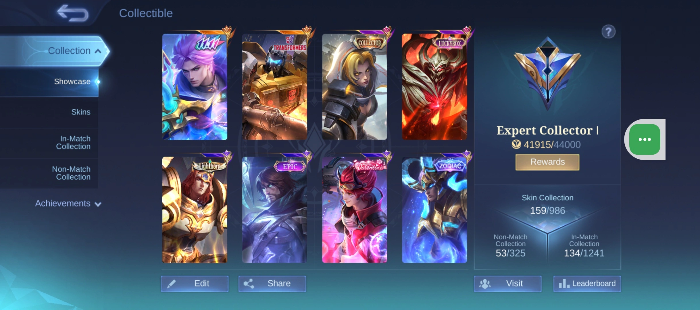 C159|LV 55|85 HERO|159 SKIN|ALL EMBLEM MAX|ROGER TRANSFORMERS|NOLAN 11.11|NATALIA COLLECTOR|ZHASK LUCKYBOX|8 EPIC|2 LIGHTBORN|2 DRAGON TAMER|3 SABER|MARTIS ZODIAC|5 STARLIGHT
