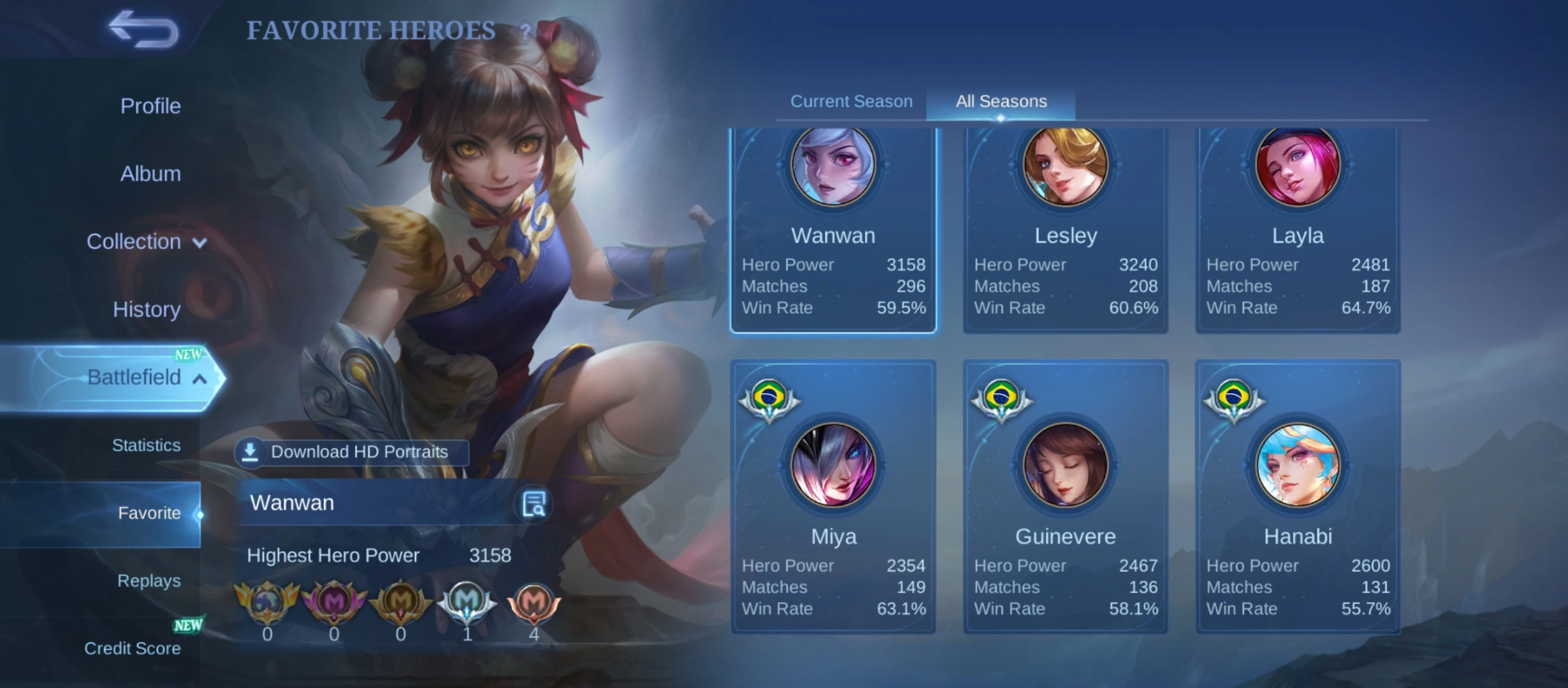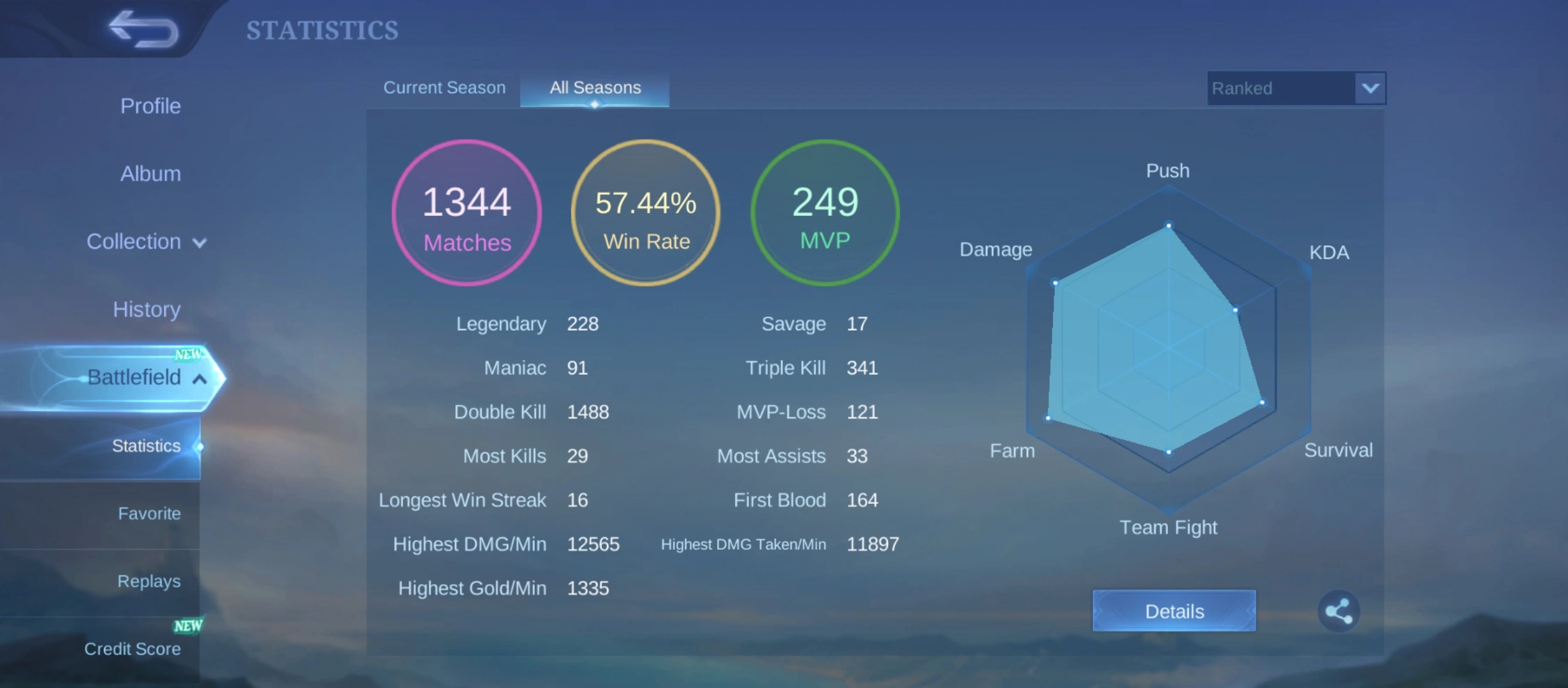 GG888|Lv 53|RENOWNED CC 3|ALL EMBLEM MAX|248 SKIN|57% HIGH WR|MIYA LEGEND|3 KOF(AURORA,PAQUITO)|FLORYN SANRIO|LESLEY ANNUAL|2 LUCKYBOX(ODETTE,ZILONG)|LEGEND 5