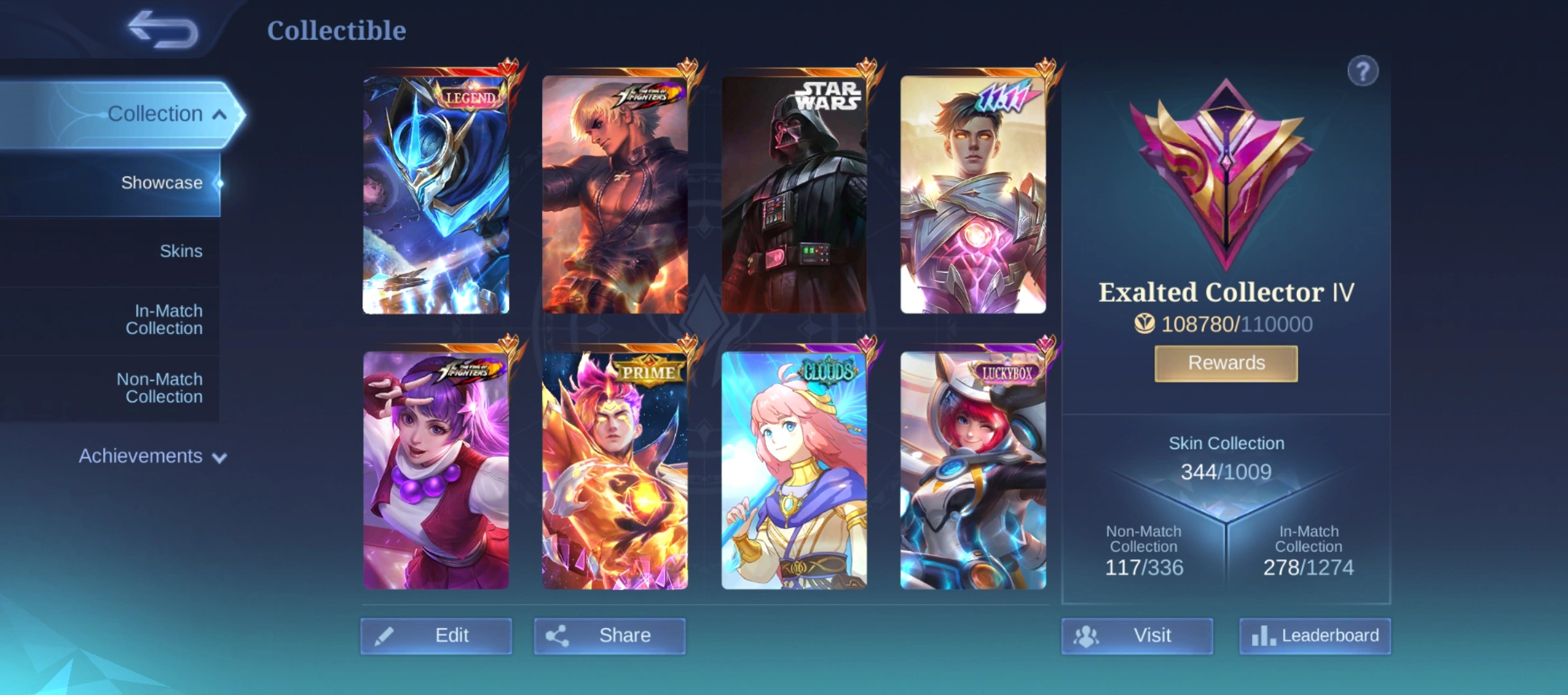 N243|LV 112|EXALTED COLLECTOR IV|344 SKIN|(GUSION LEGEND,KOF,11.11)|ARGUS STARWARS|FLORYN SANRIO|CLAUDE PRIME|2 KOF|ROGER GRIMLOCK|KAGURA CLOUDS