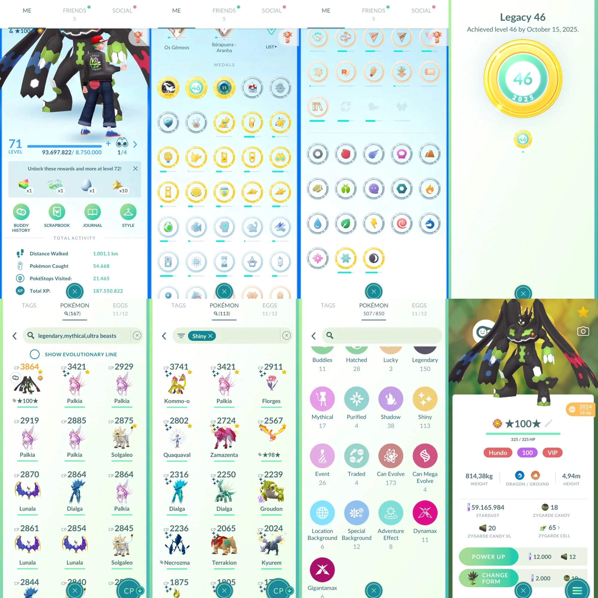 High Level 71+;7 Legend iv100; Zygarde form 3 iv100; 167 legend; 113 shiny; 44 Hundo; 59mil+ Stardust;184m+ XP-26 Costume;12 special background; 11 Dynamax-20 medal
