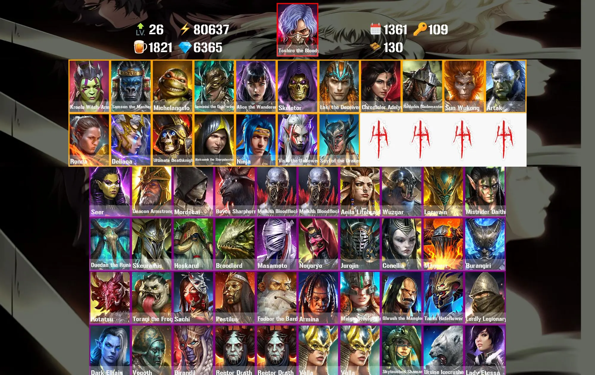 1361 Days 80.6k Energy [Mythical Starter] Toshiro the Bloody ⸱ Kreela Witch-Arm ⸱ Samson the Masher ⸱ Michelangelo ⸱ Leminisi the Gold-wing ⸱ Alice the Wanderer ⸱ Seer ⸱ Deacon Armstrong ⸱ 48.4m Silver ⸱ 6.4k Gems
