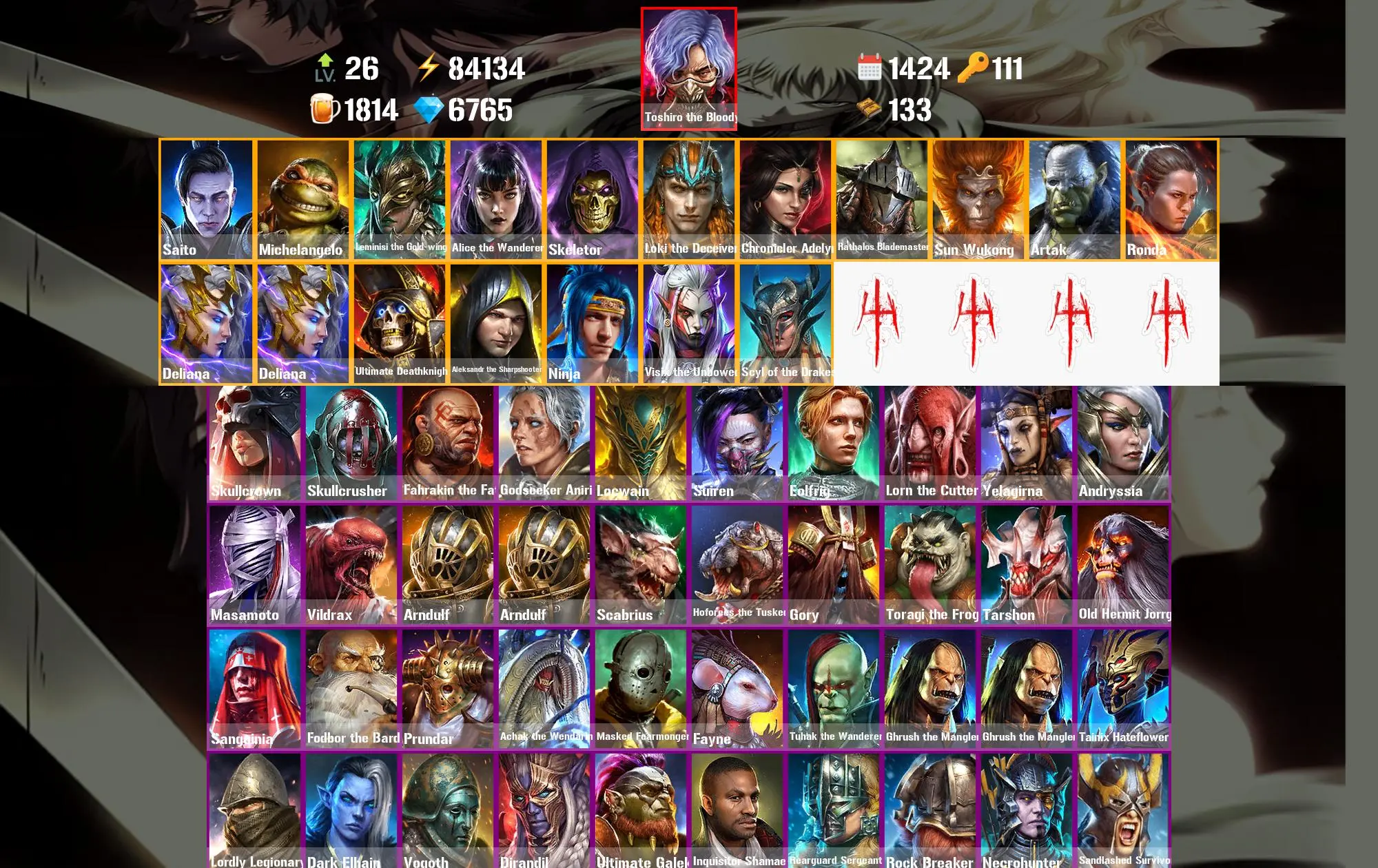 1424 Days 84.1k Energy [Mythical Starter] Toshiro the Bloody ⸱ Saito ⸱ Michelangelo ⸱ Leminisi the Gold-wing ⸱ Alice the Wanderer ⸱ Skeletor ⸱ Skullcrown ⸱ Skullcrusher ⸱ 53.0m Silver ⸱ 6.8k Gems