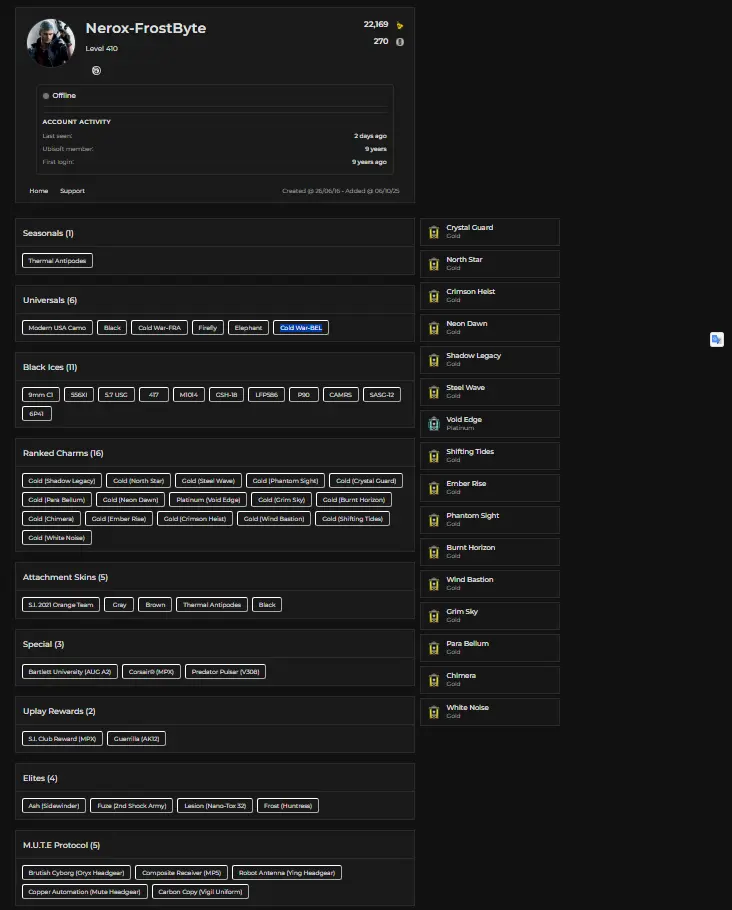 🔥【PC / PSN / XBOX】• Level 410 • 30+ Operators • Black Ices (11) • Universals (6) • Ranked Charms (16x 1.0) • Elites (4) • 342 Total Skins • 22,169 Renown 💎