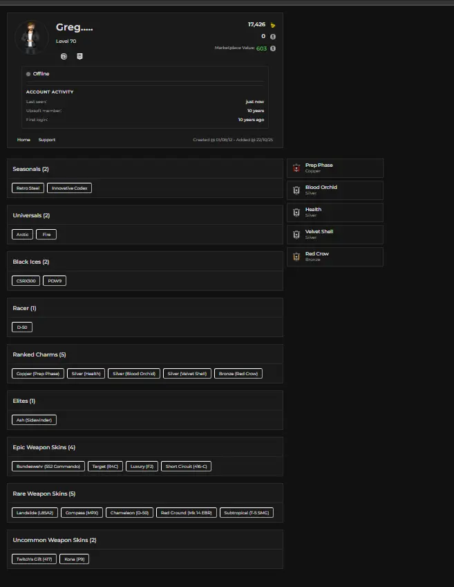 🔥【PC/PSN/XBOX】 • Level 70 • 21 Total Skins • 2x Universals • 2x Black Ice • Racer x1 • Elite x1 • Silver IV Rank • 17,426 Renown 💎