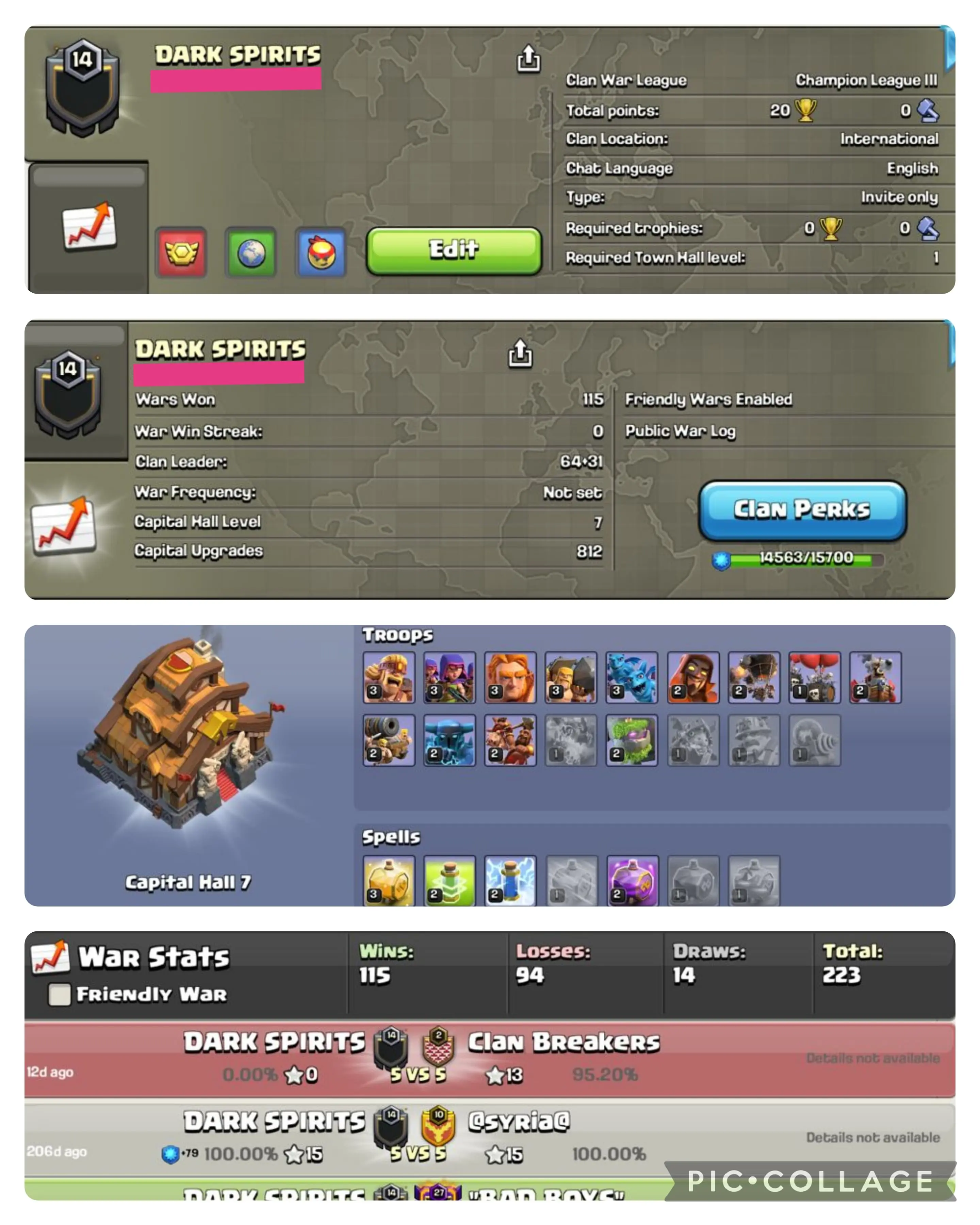🤩CHAMPION 3 + CC 7 🤪 NAME : DARK SPIRITS 🤗 LEVEL : 14.9 🤭 115 WINS 94 LOSSES 14 DRAWS 😍