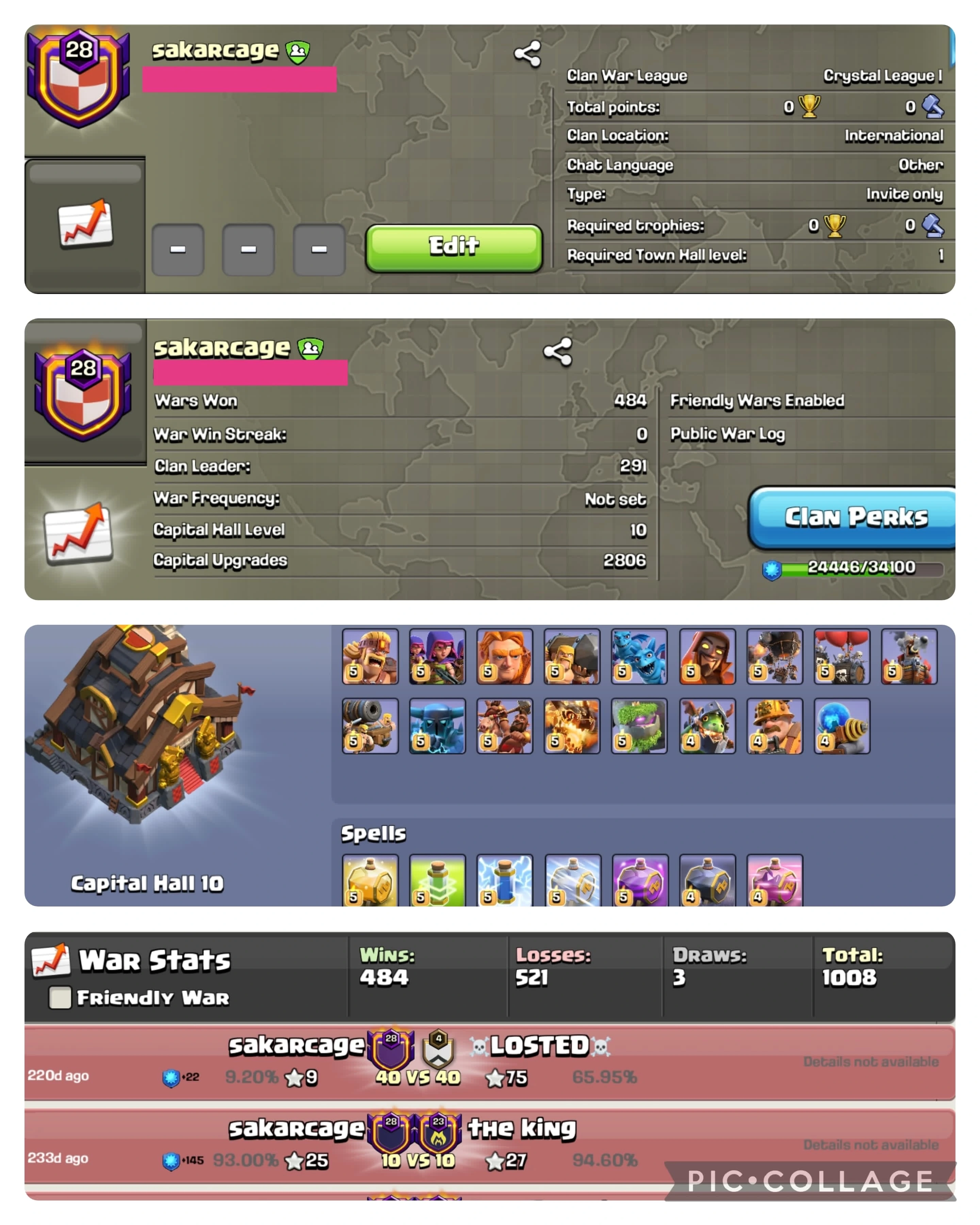 🥰CRYSTAL 1 + MAX CC 🤭 LEVEL 28.8 😍 NAME : SAKARCAGE 🤗 484 WINS 521 LOSSES 3 DRAWS 1K PLUS WARS 😁